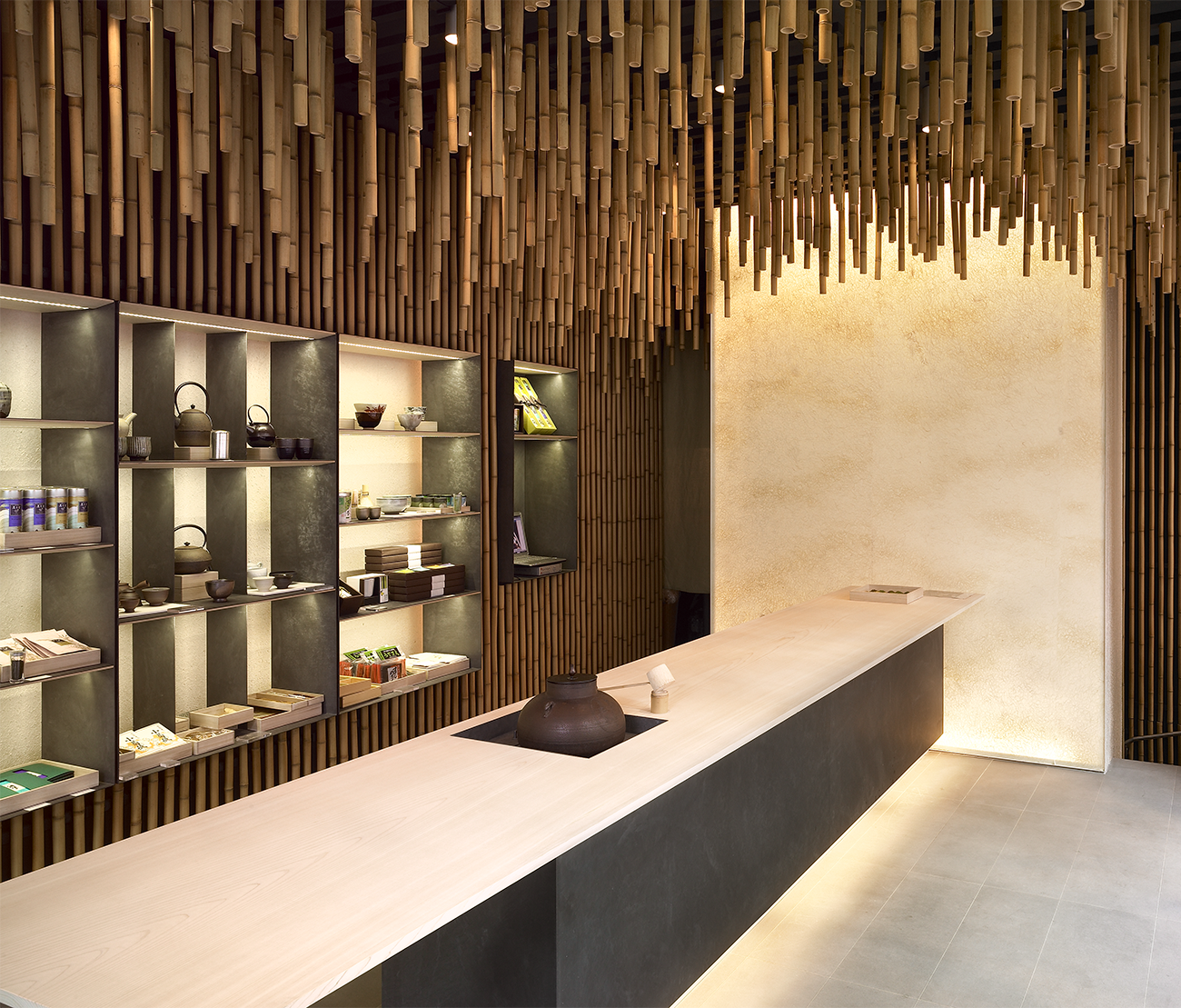 Our other two boutiques - Paris & Ginza Kabuki-za - were also designed using bamboo as a material. However, for our Tsukiji space, we wanted to create an airy space evoking openness to the outdoors and the freshness of a nodate ceremony. In the bustling atmosphere of the Tsukiji quarter, bamboo waved from the walls and ceiling, spreading out like an umbrella to warmly envelop visitors. The store, without partitions, is an extension of the street, attracting the curious as if a real tea ceremony under an umbrella were taking place right before their eyes, offering a relaxing experience.