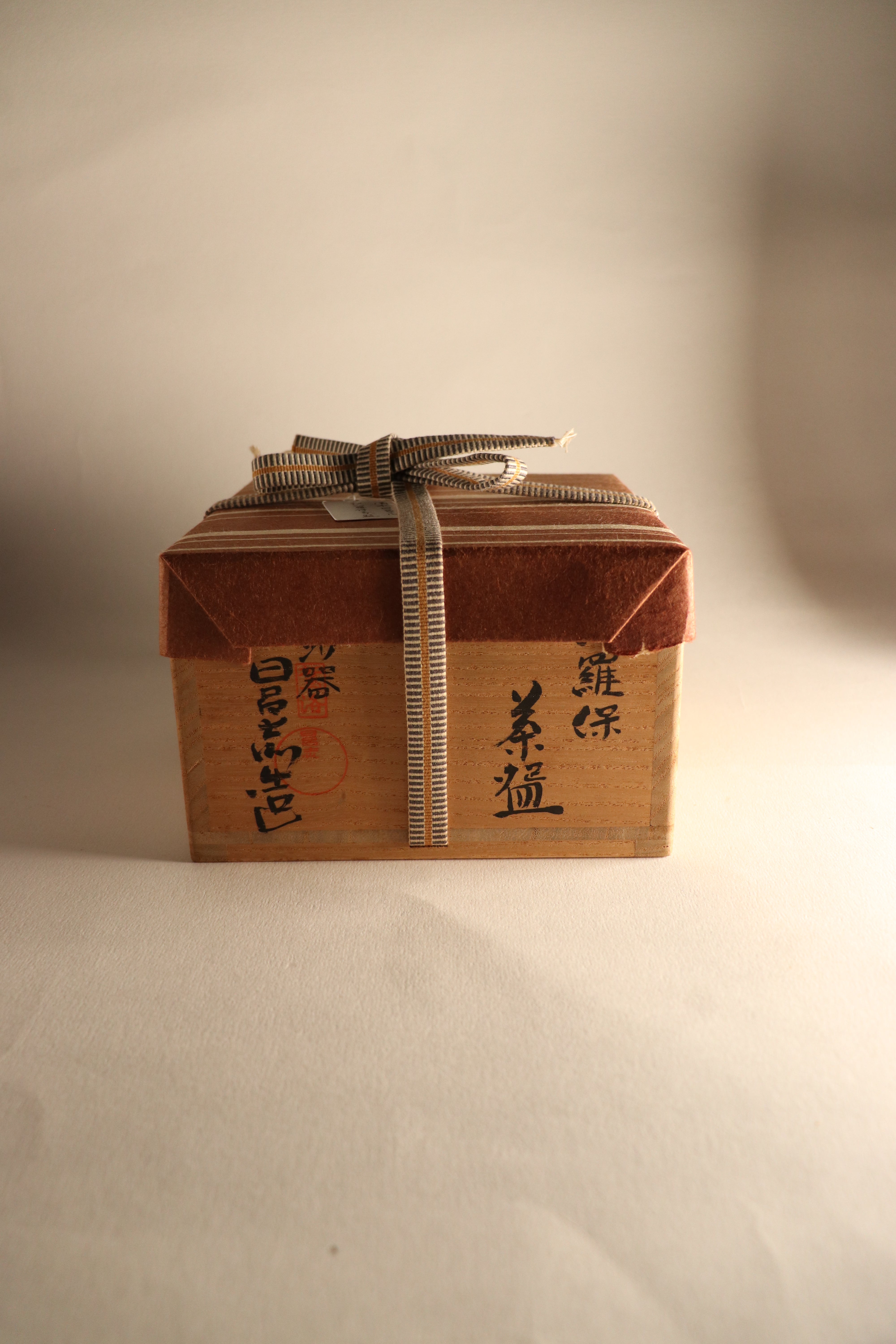 Ce bol à matcha de type Irobo chawan (伊羅保茶碗) a été façonné par Shimizu Hiroshi (清水日呂志, né en 1941), maître potier de la région de Mie et héritier de la lignée du premier Shimizu Rakuzan, fondateur d’un des fours historiques du Banko-yaki. Connu pour avoir introduit dans cette tradition la céramique de style coréen dite Kōraide (高麗手), Shimizu a profondément renouvelé le regard du monde du thé sur le Banko-yaki, lui conférant une dimension plus rustique et spirituelle, fidèle à l’esthétique du wabi-cha.