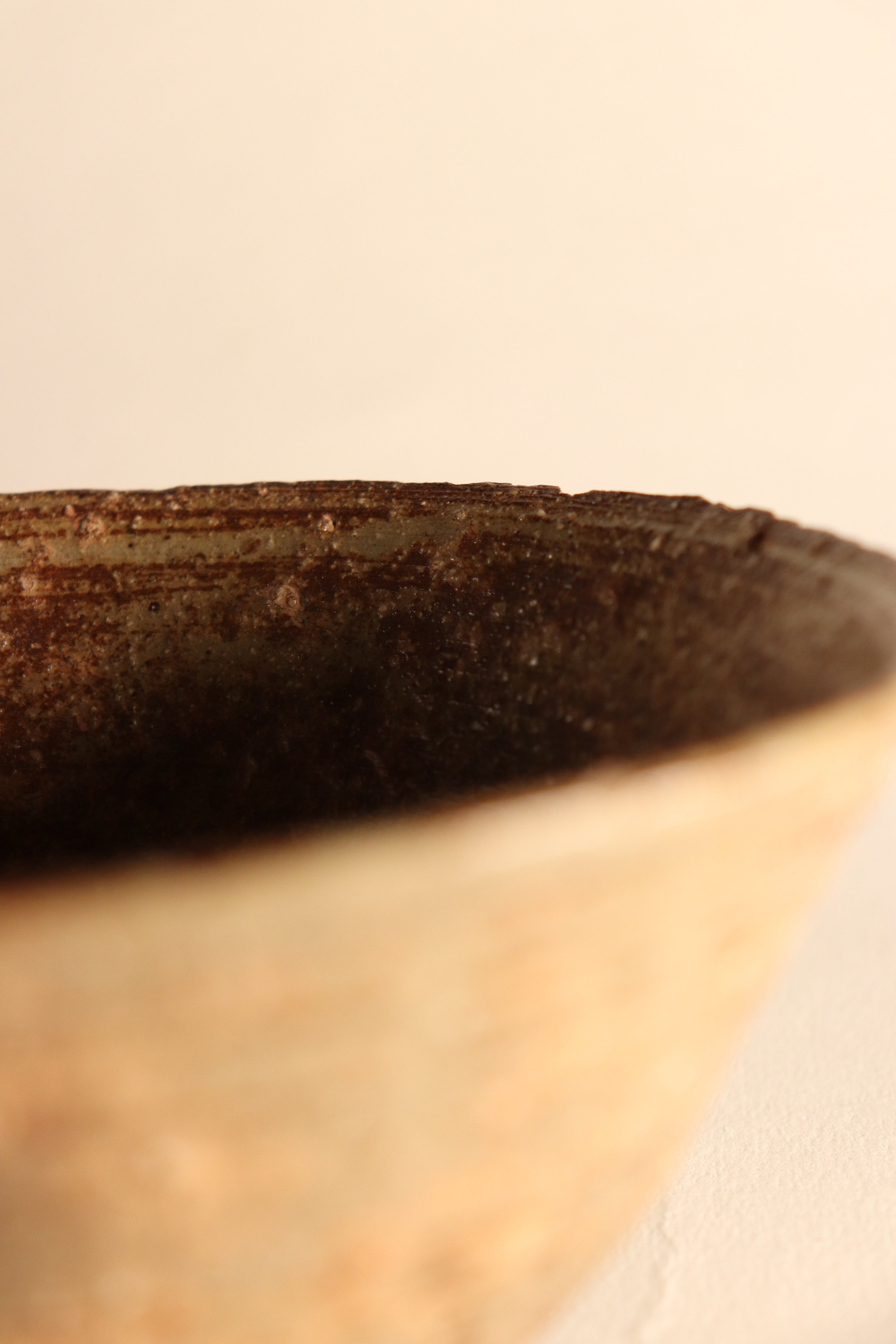 Le style Irobo, né dans la péninsule coréenne à l’époque Joseon, est caractérisé par une terre mêlée de grains de sable et une glaçure irrégulière, donnant à la surface une texture granuleuse et une apparence « piquée » qui exprime la vigueur et la rusticité du matériau. Sa forme ouverte, au large pied et au bord légèrement rentrant, évoque les bols commandés spécialement pour le thé dès le XVIIe siècle, adaptés à la main et au regard du buveur.