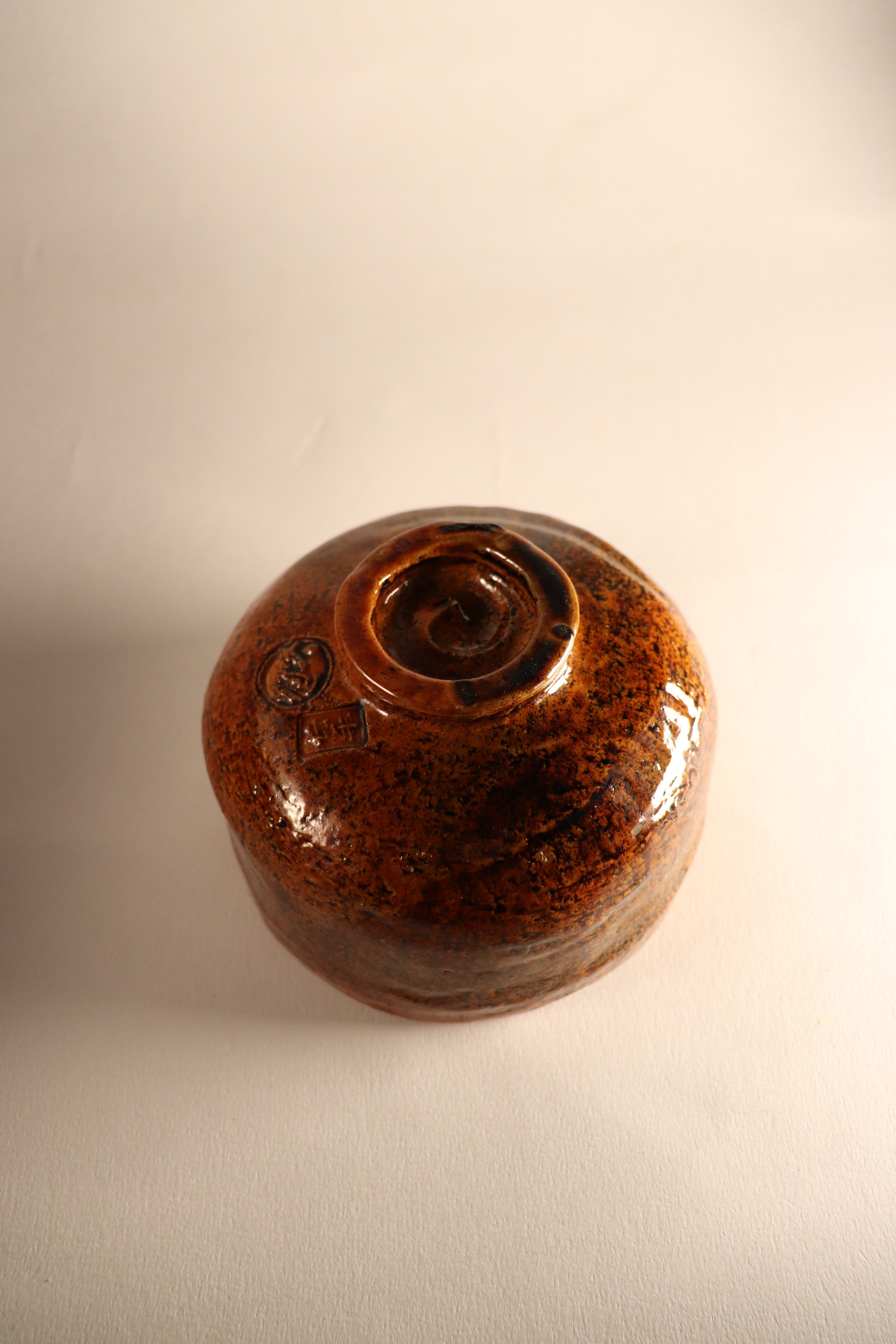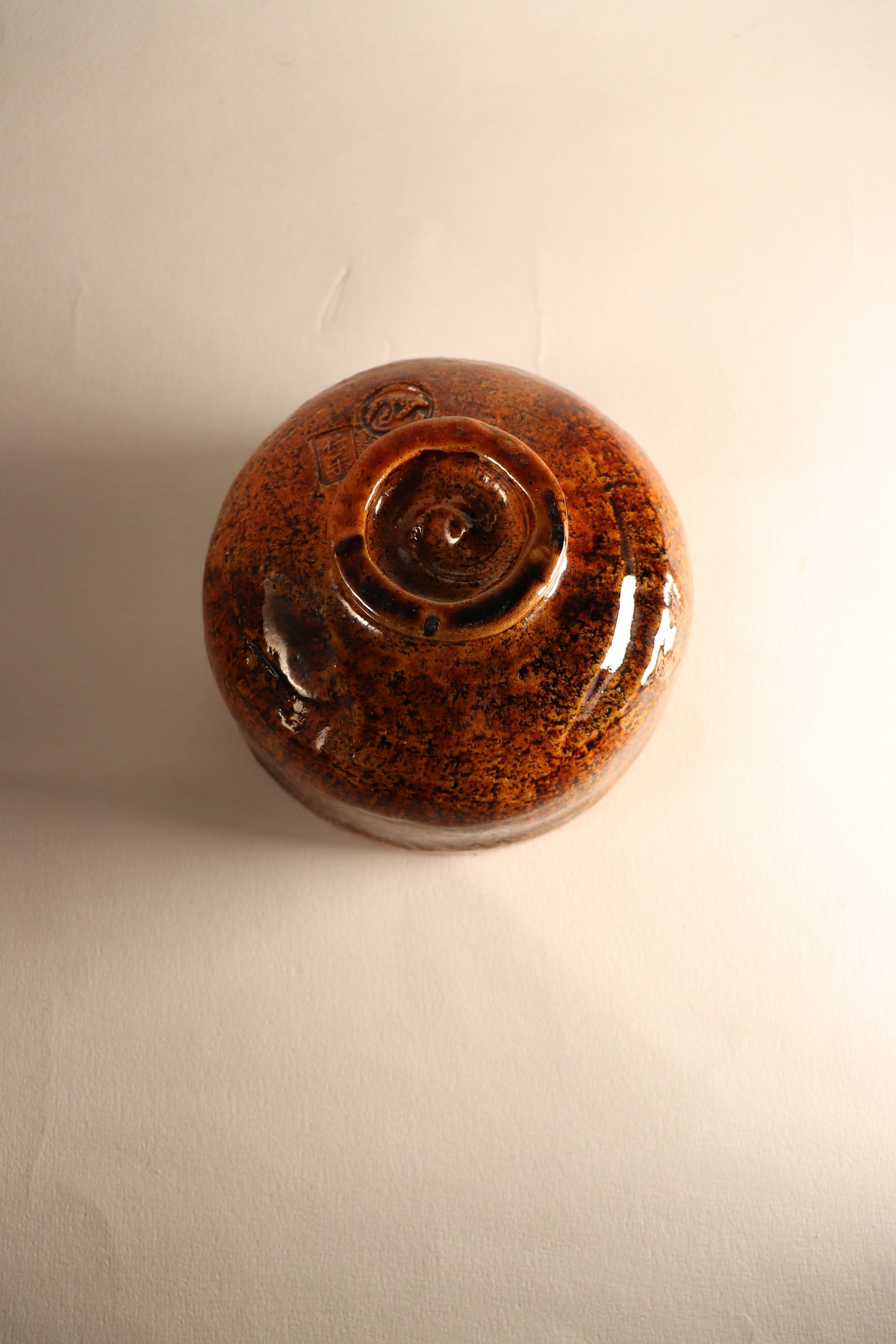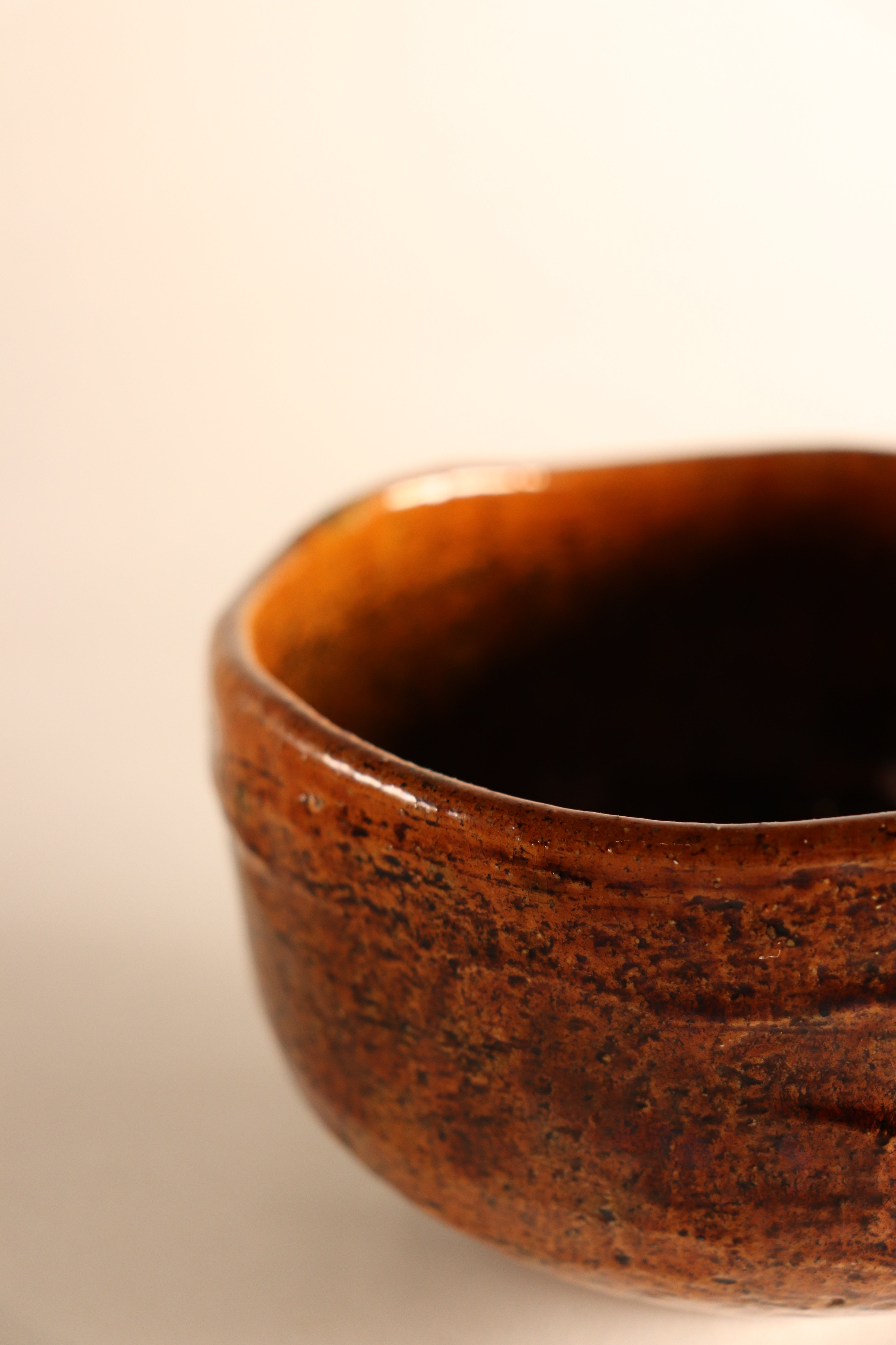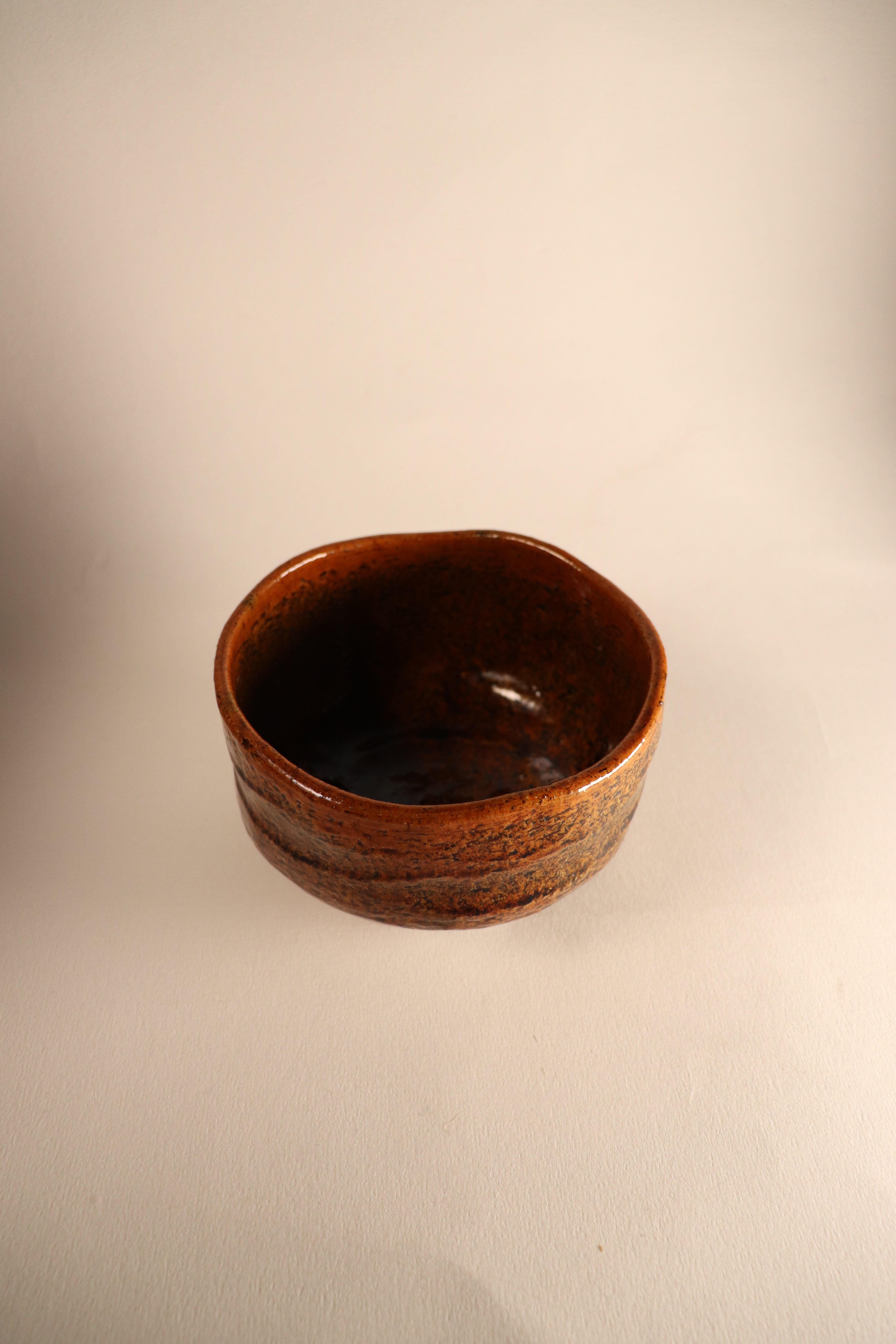 Ōhi ware is best known for its amber glaze (ame-yū) — a type of iron-based glaze fired in an oxidizing atmosphere, producing warm, translucent hues ranging from honey to chestnut brown. This gentle, glossy surface harmonizes beautifully with the soft clay body typical of Raku, creating works that feel both earthy and luminous. Each bowl, shaped entirely by hand without a wheel, bears the living trace of the artist’s touch and the unpredictable breath of the kiln.