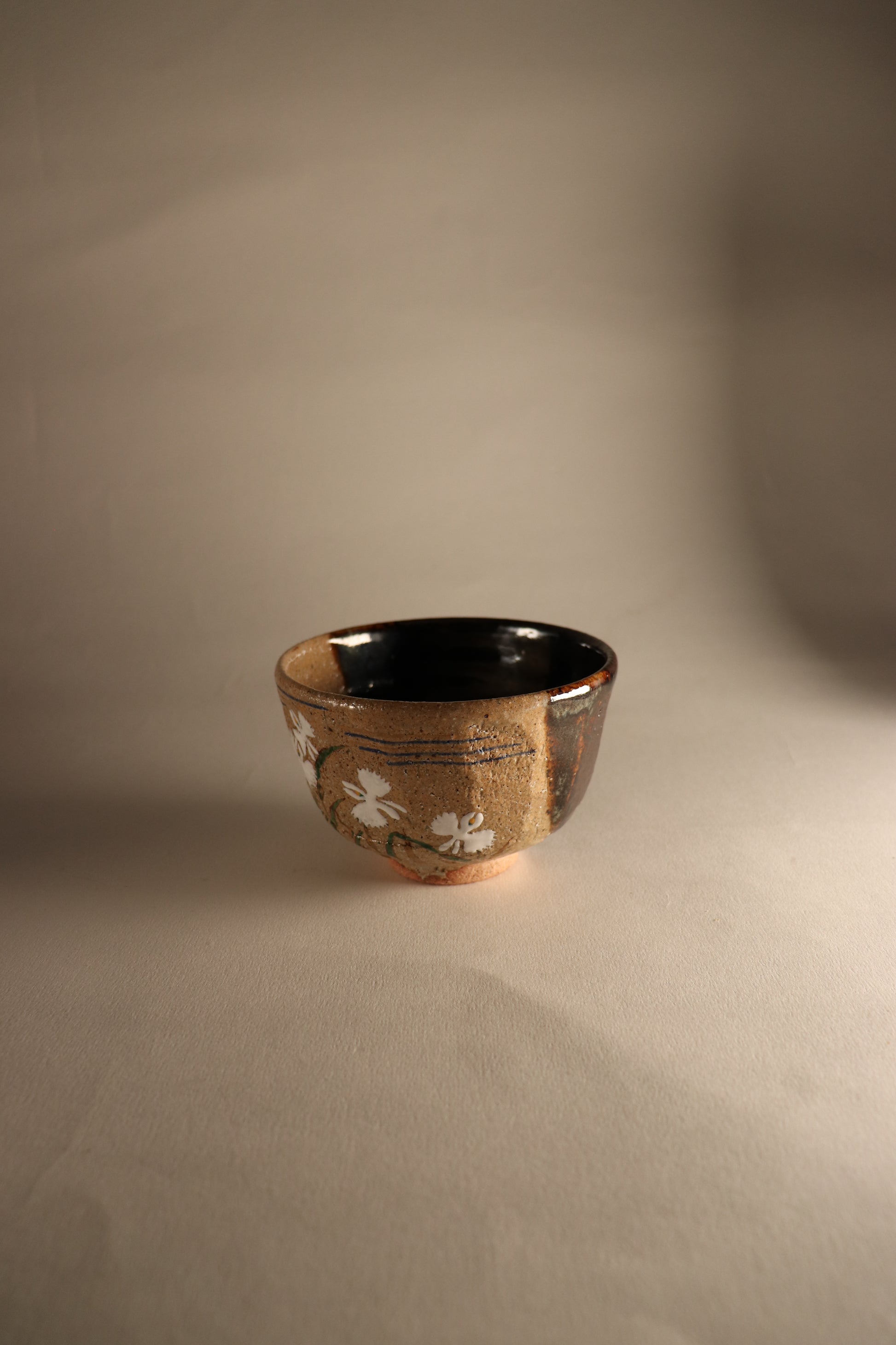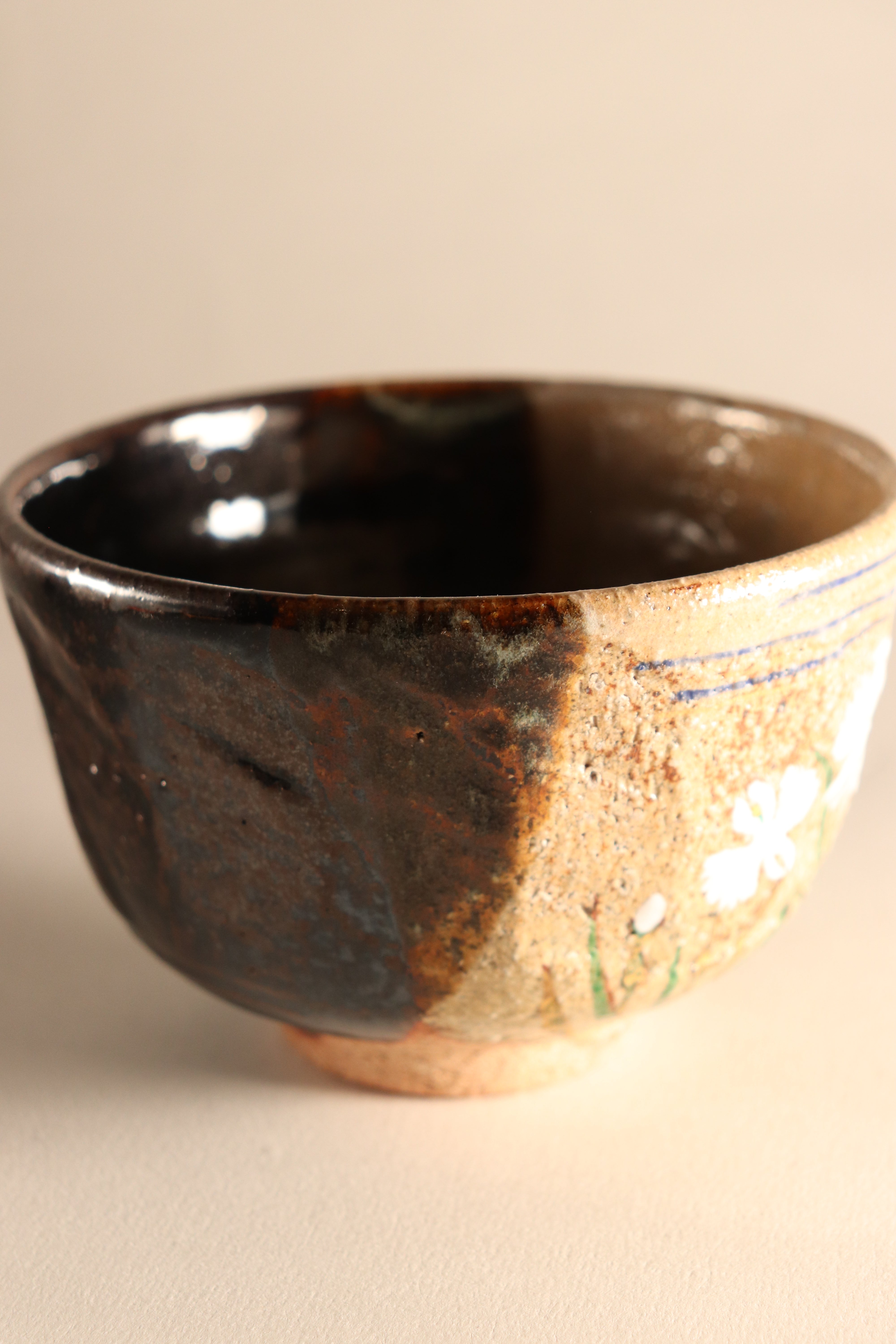 Sur ce bol, la fleur de sagi-sō est rendue avec grâce et légèreté, dans l’esprit raffiné du Kyō-yaki. Son dessin fin, à la fois aérien et lumineux, rappelle la fragilité des émotions et la beauté éphémère de la nature — thèmes chers à la céramique japonaise et à l’esthétique du thé.