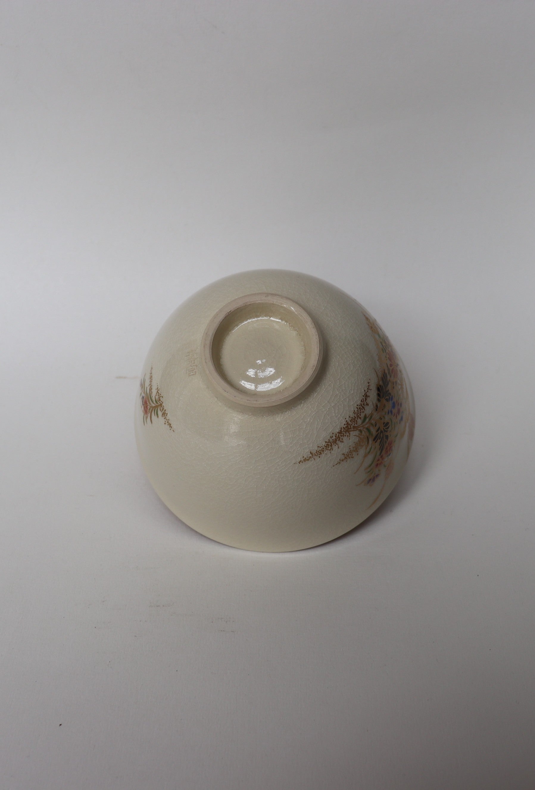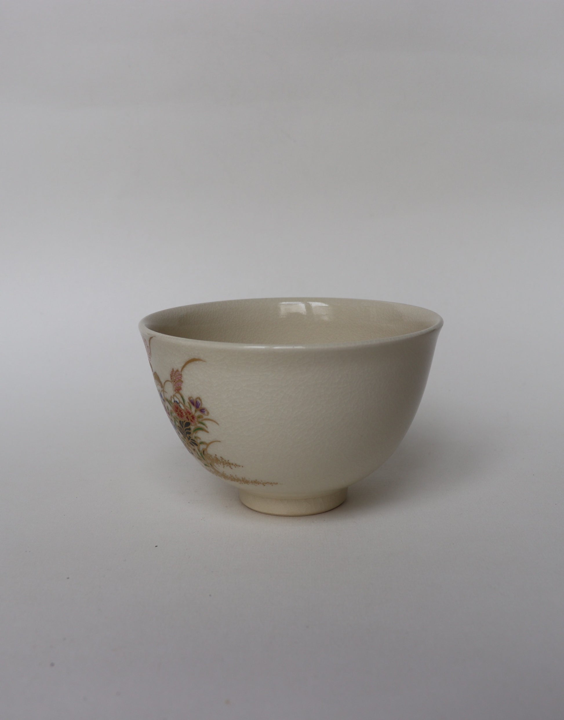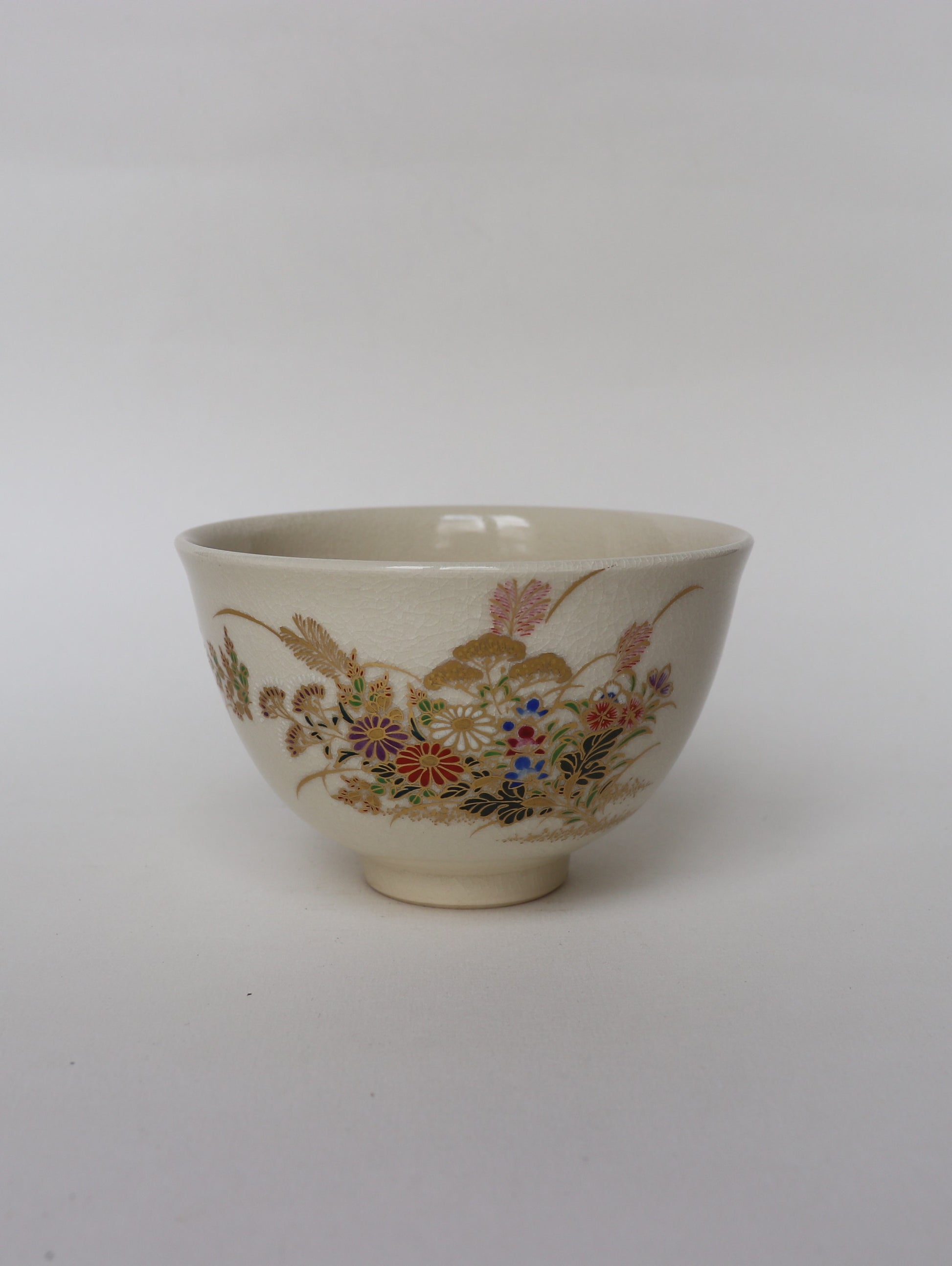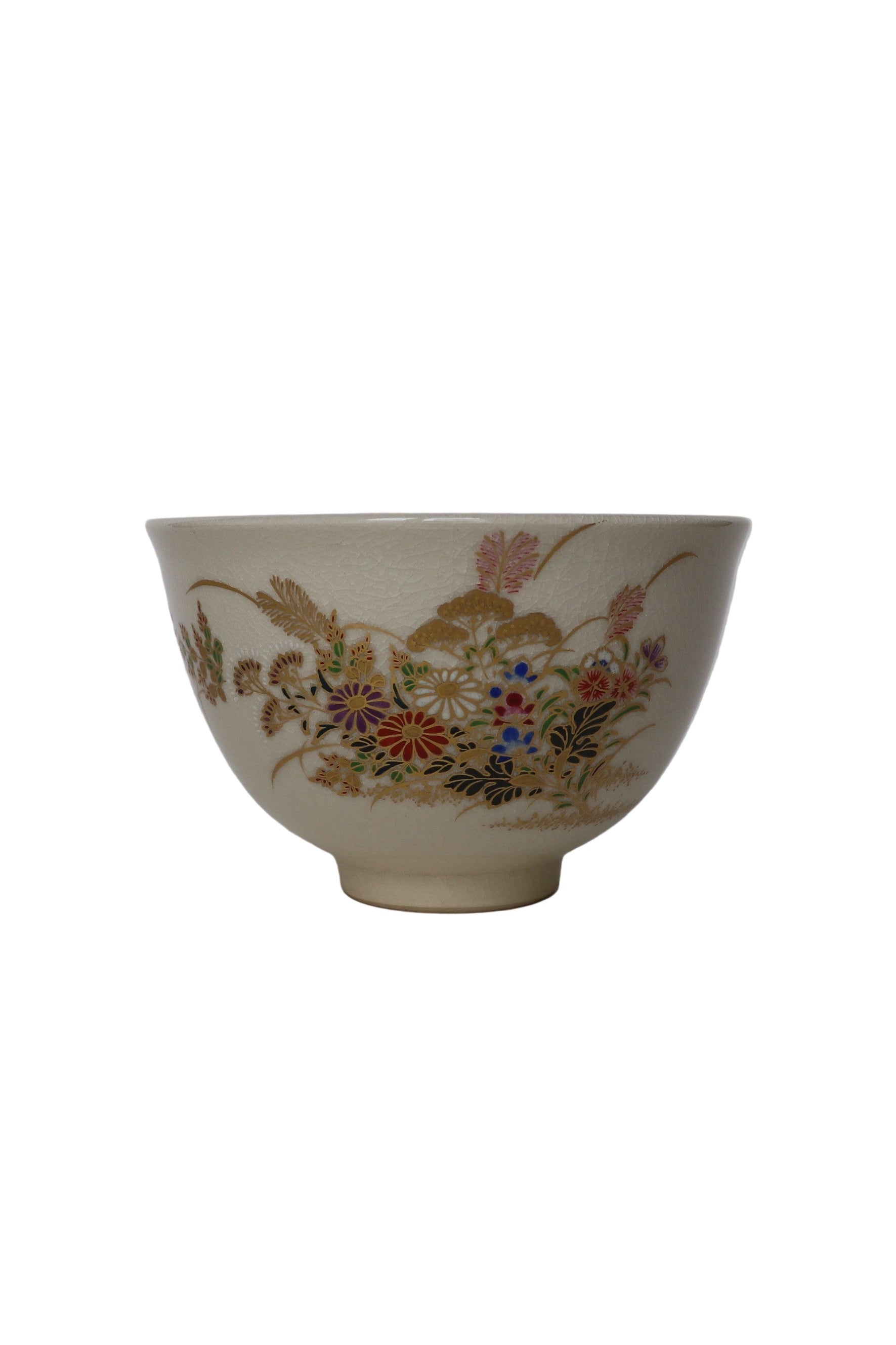The bowl’s decoration features the Seven Flowers of Autumn (Aki no Nanakusa) — bellflower, bush clover, patrinia, pink, kudzu, pampas grass, and thoroughwort — motifs celebrated in classical poetry for their evocation of fleeting beauty. The design, rendered in fine overglaze enamels and delicate gold, exemplifies the Shiro Satsuma style, admired for its soft ivory glaze and intricate detailing.