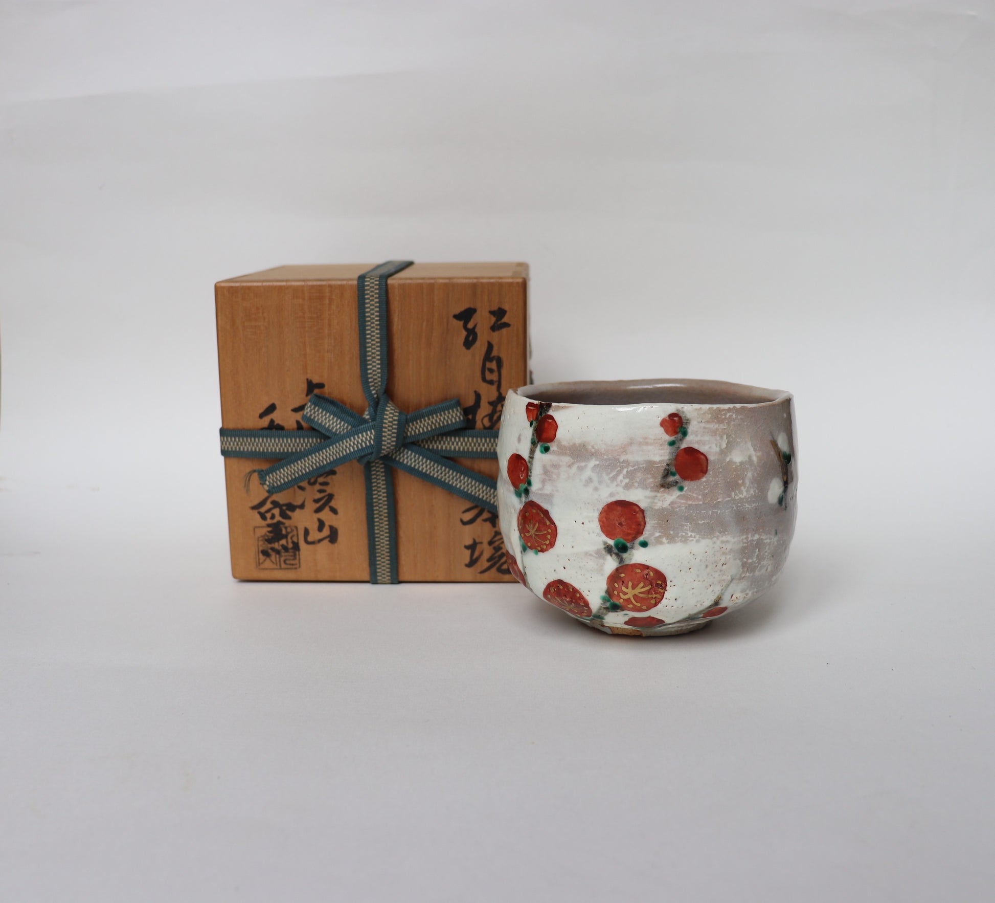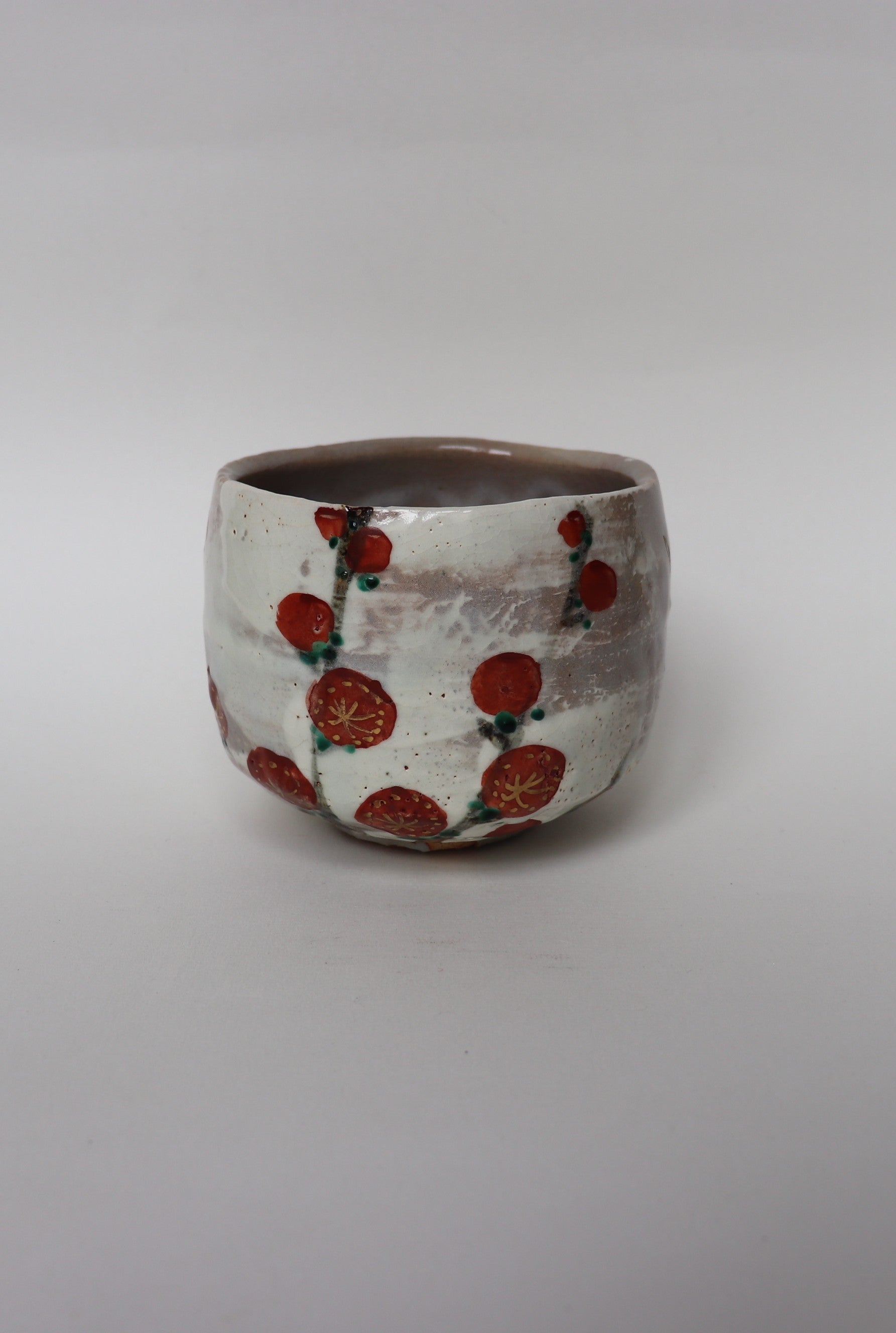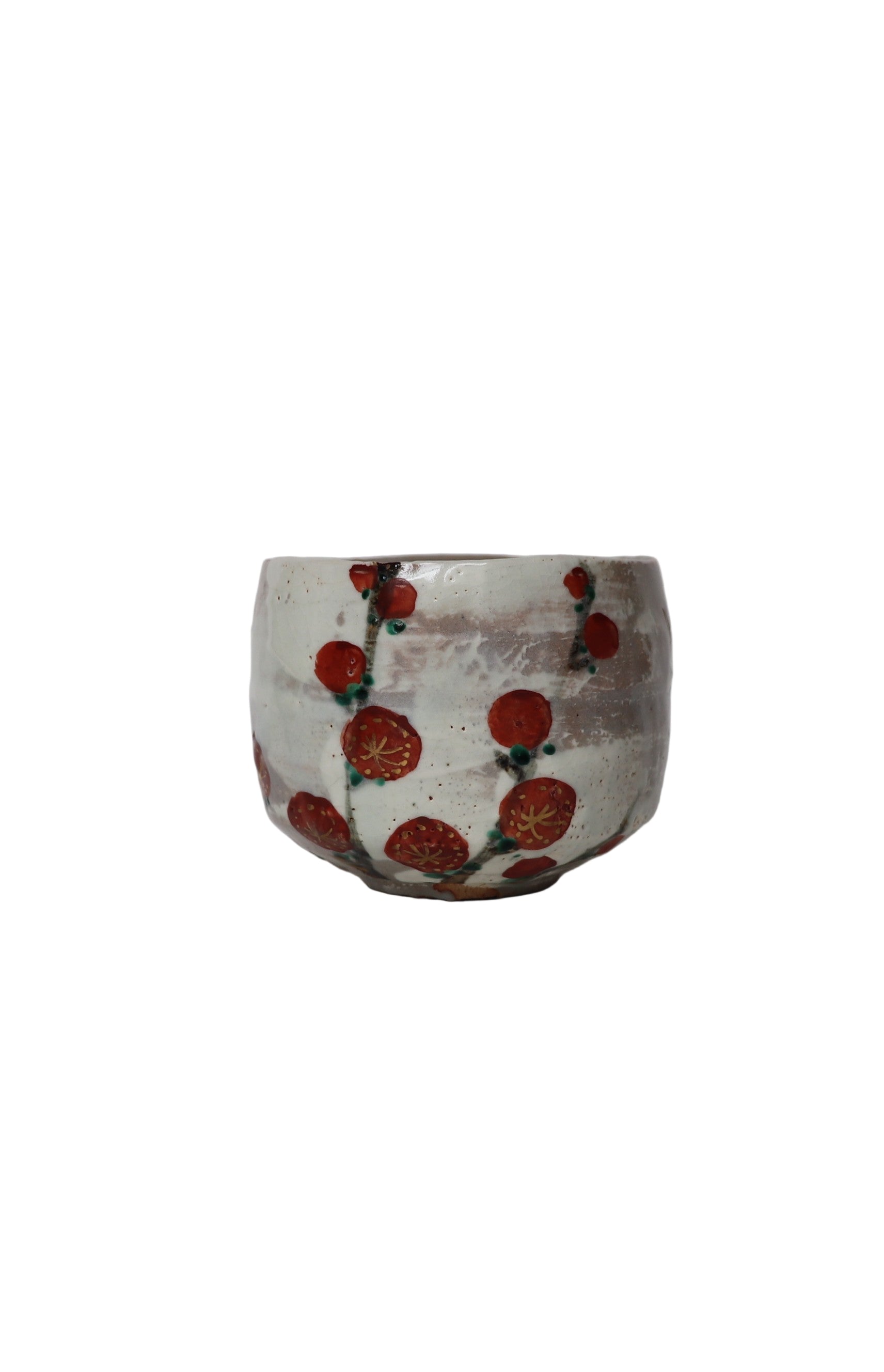 This bowl features a design of red and white plum blossoms (eda-ume), symbolizing perseverance and renewal — flowers that bloom even while snow remains on the ground. Such motifs, popular during the Momoyama period, combine the white of snow and the red of plum petals to express the unique beauty of the Japanese seasons.