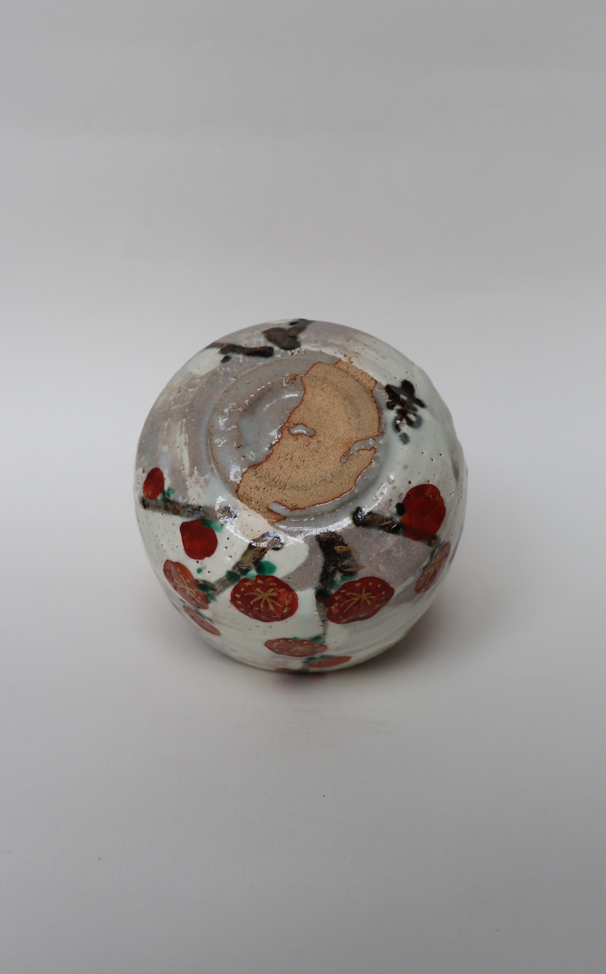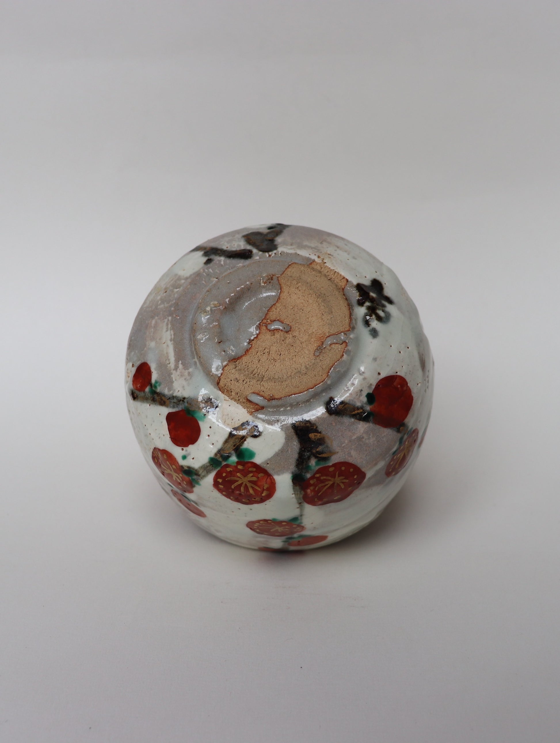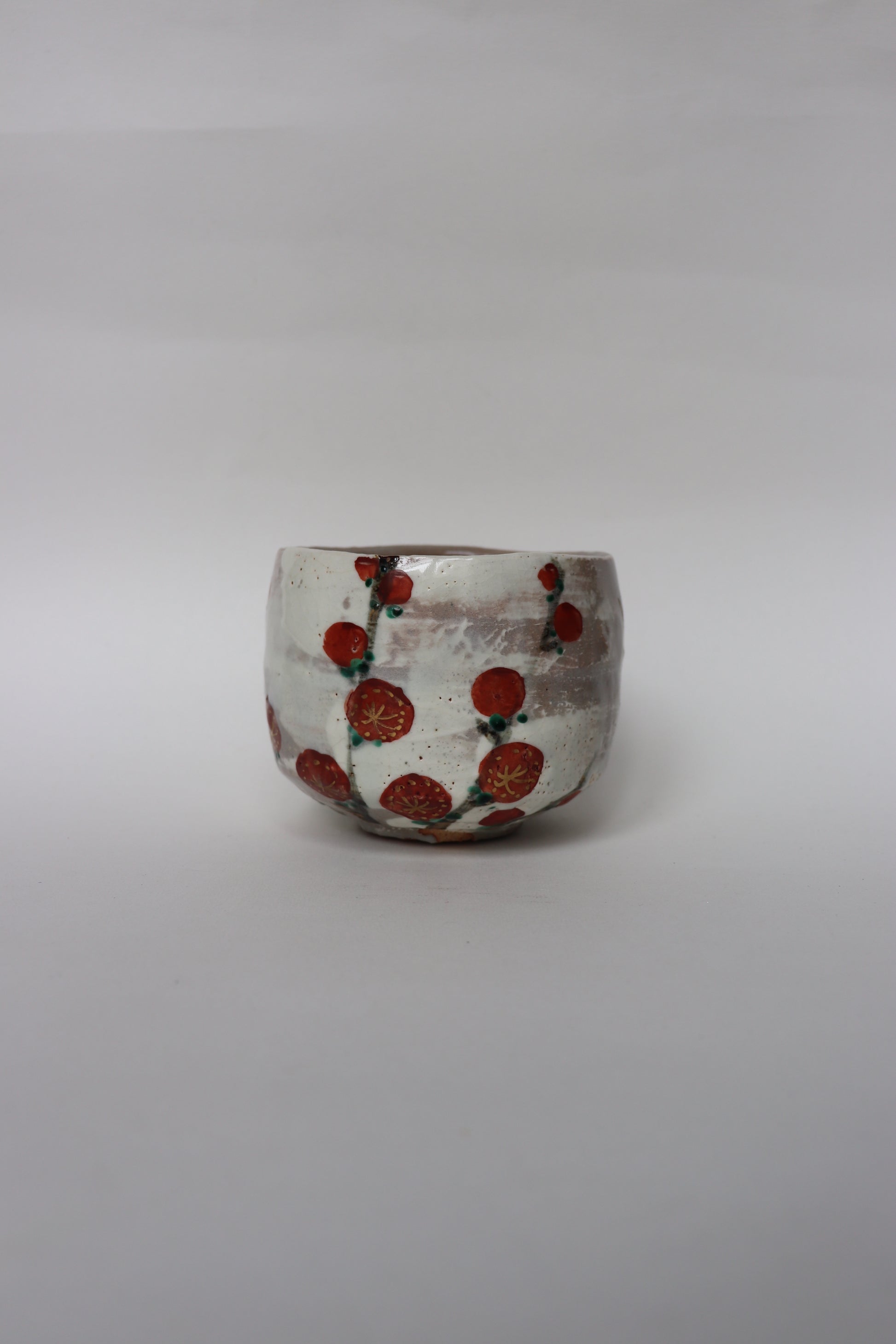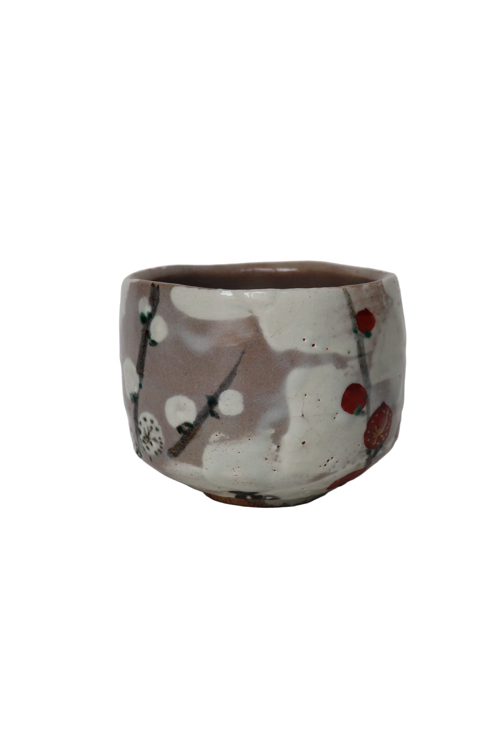 This bowl features a design of red and white plum blossoms (eda-ume), symbolizing perseverance and renewal — flowers that bloom even while snow remains on the ground. Such motifs, popular during the Momoyama period, combine the white of snow and the red of plum petals to express the unique beauty of the Japanese seasons.