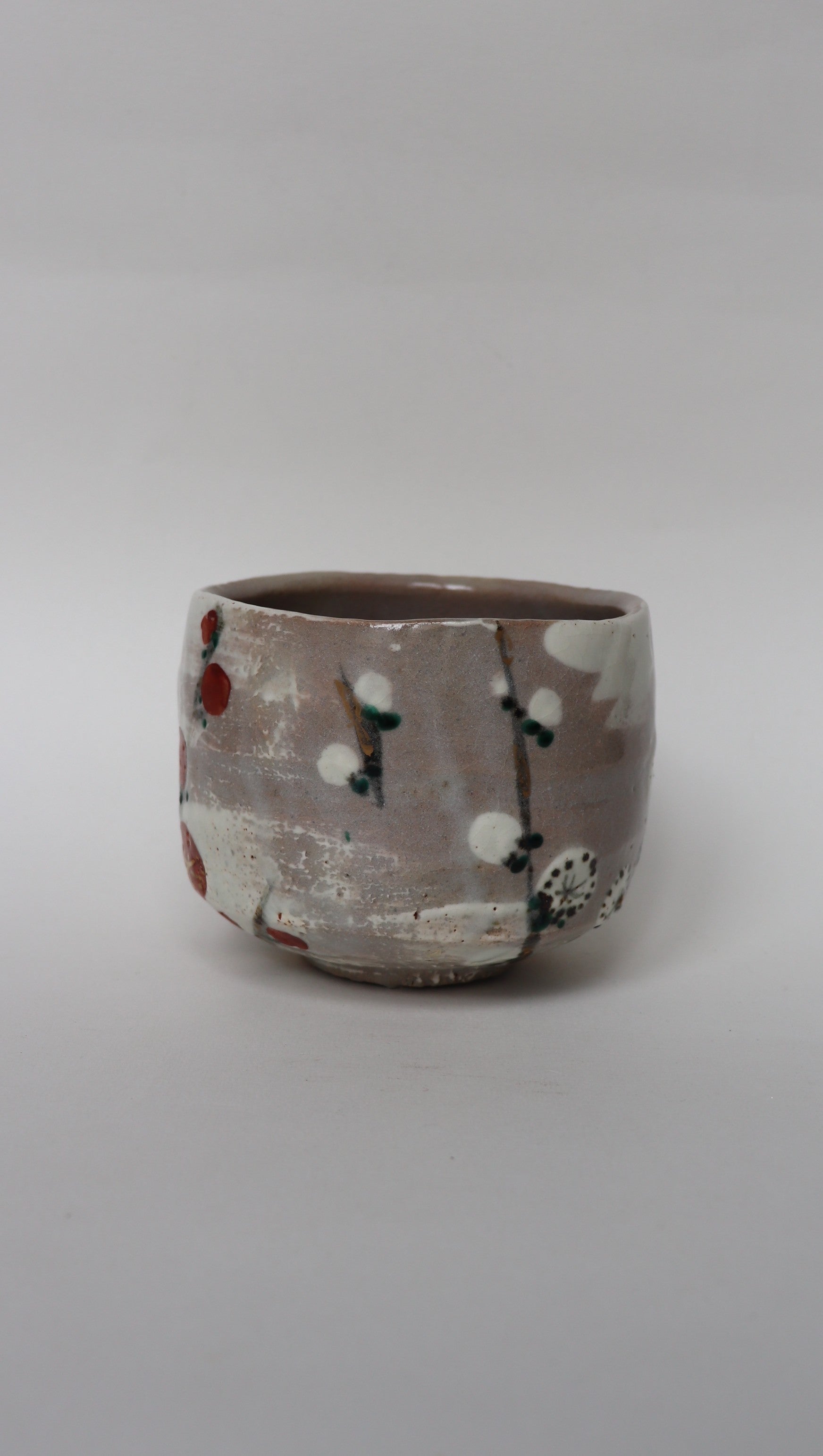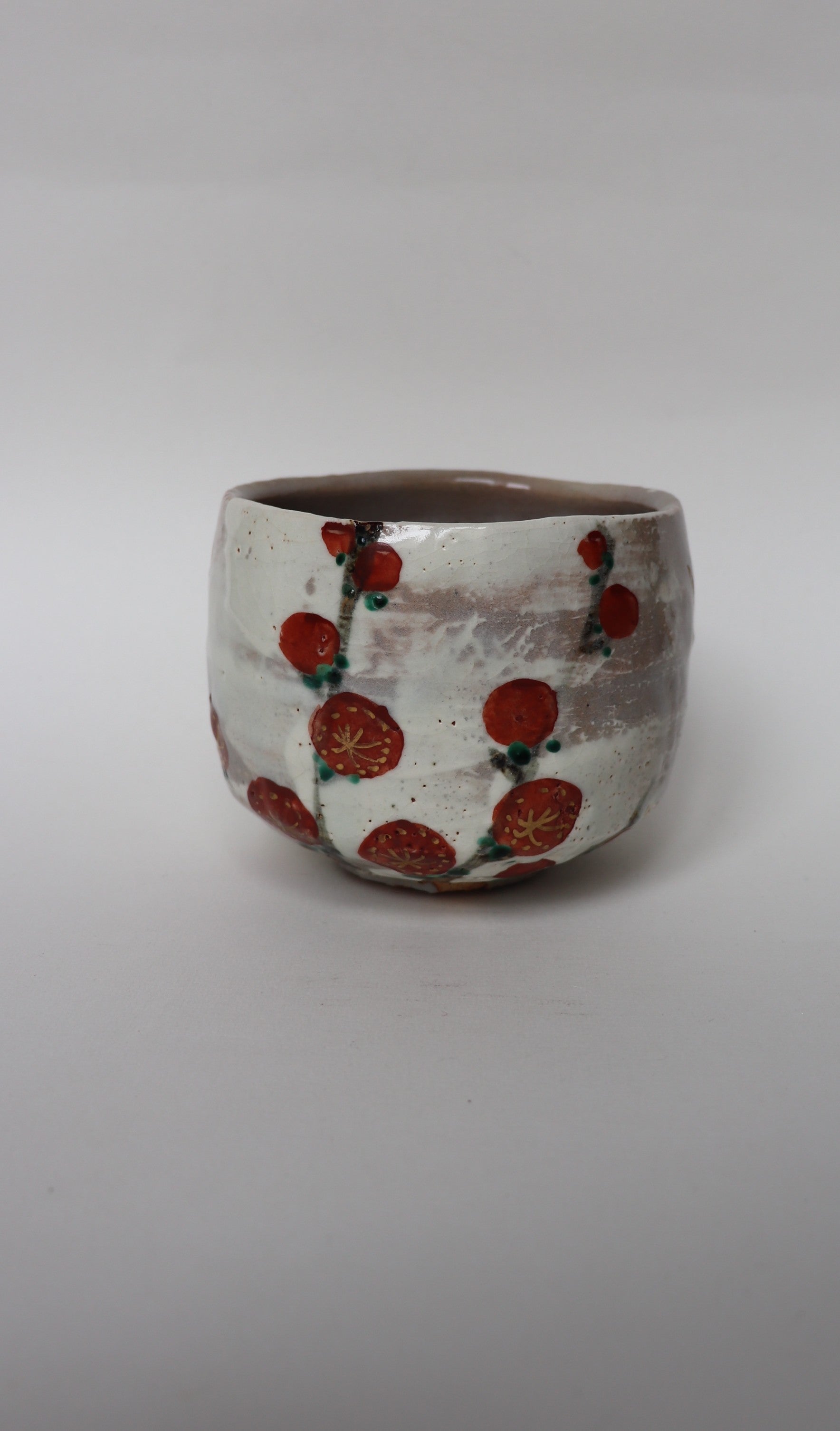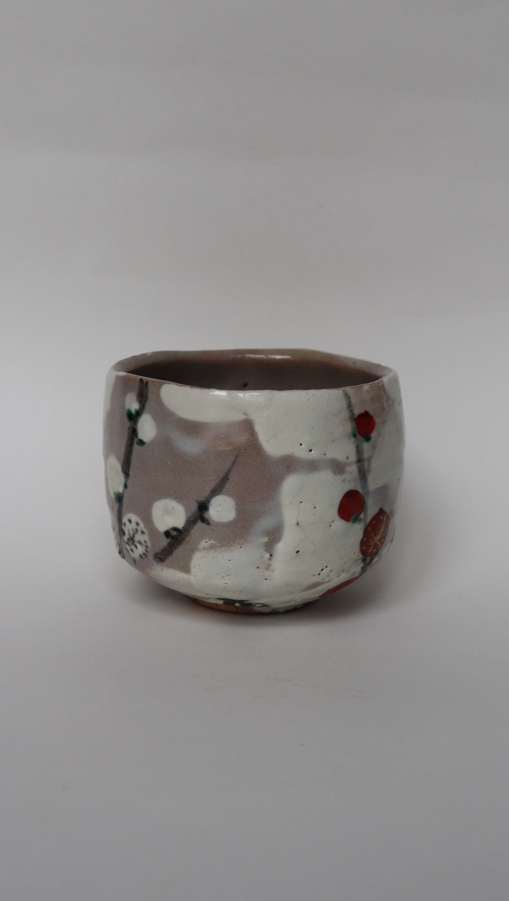 Son œuvre, connue sous le nom d’« Arakawa Shino », se distingue par une pâte épaisse et douce, une glaçure blanche légèrement rosée et une texture ponctuée de petites cavités naturelles dues à la cuisson. Dans ce bol, Arakawa a représenté des branches de prunier rouges et blanches — un motif appelé eda-ume (枝梅), symbole d’endurance et de renouveau. Ces fleurs, qui peuvent éclore avant la fonte des neiges, évoquent la beauté des saisons japonaises et la coexistence du froid et de la vie renaissante. Ce type de décor, apparu à l’époque Momoyama, figurait souvent dans les tissus et objets de cérémonie, où la combinaison du blanc de la neige et du rouge du prunier exprimait la pureté et la vitalité.