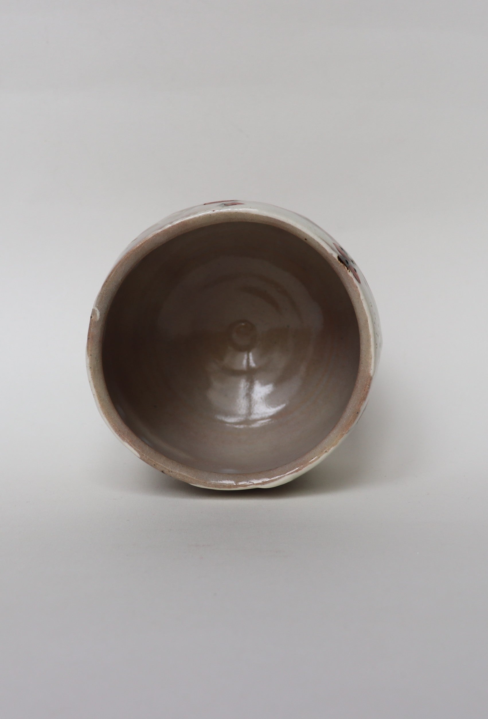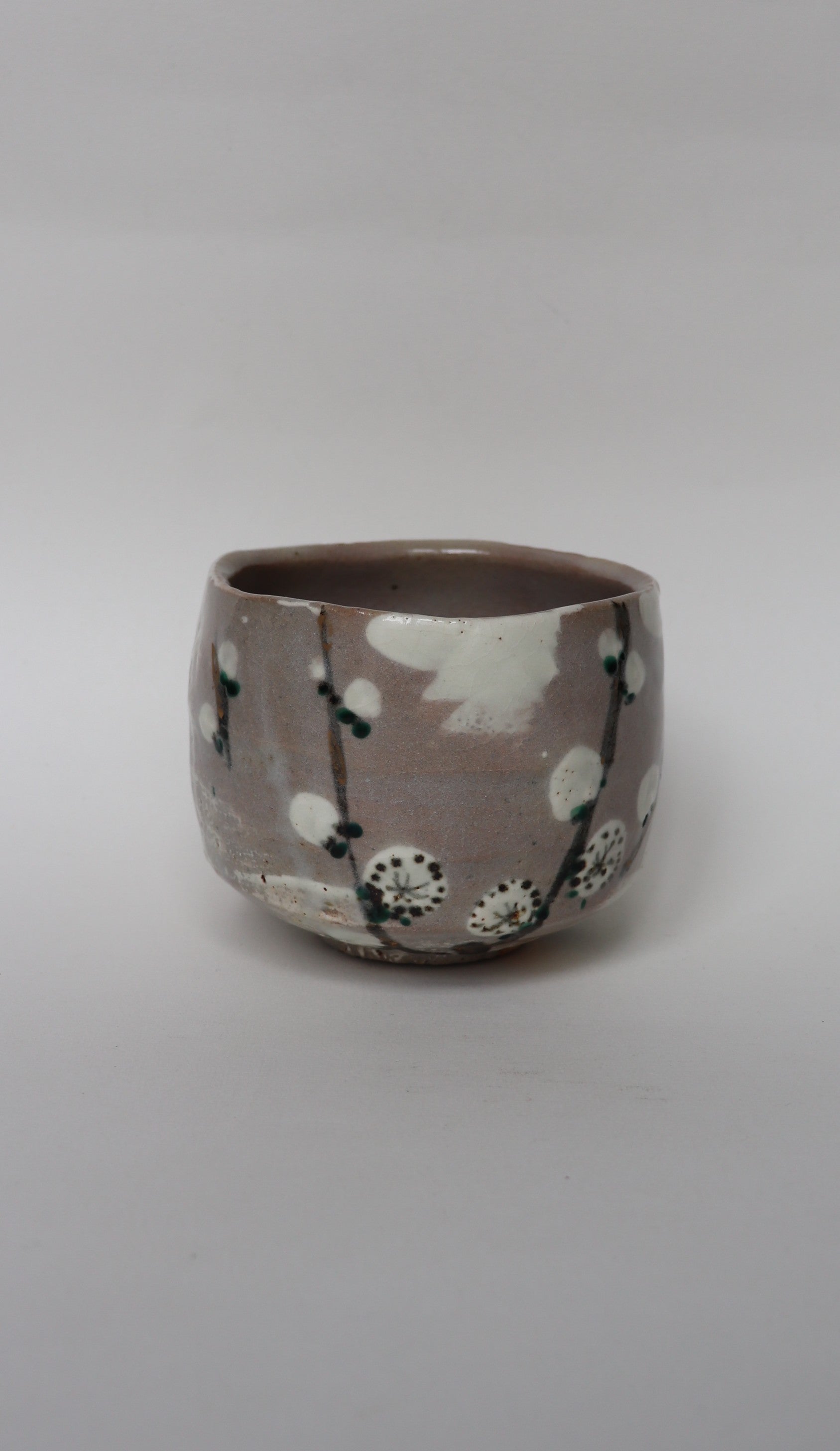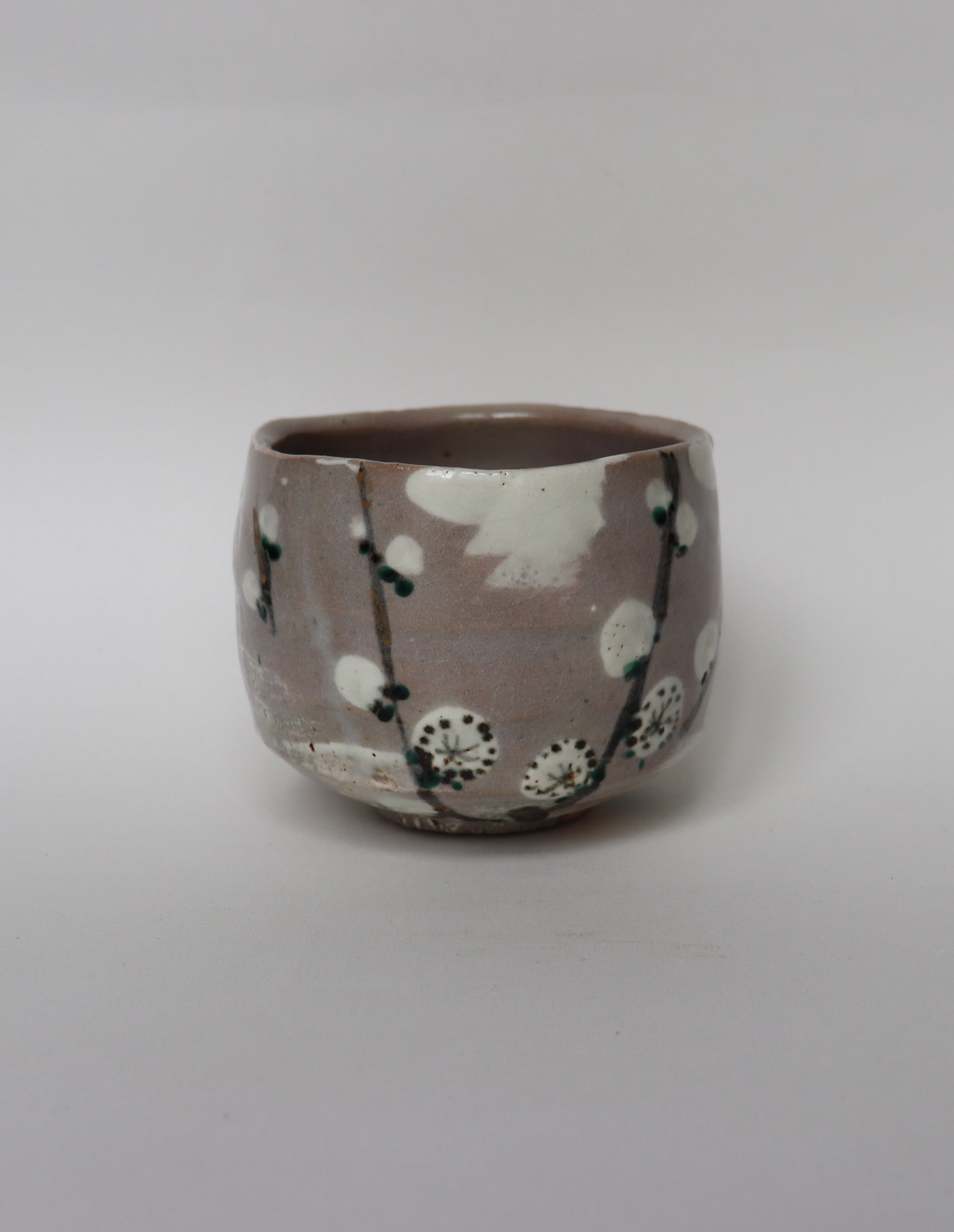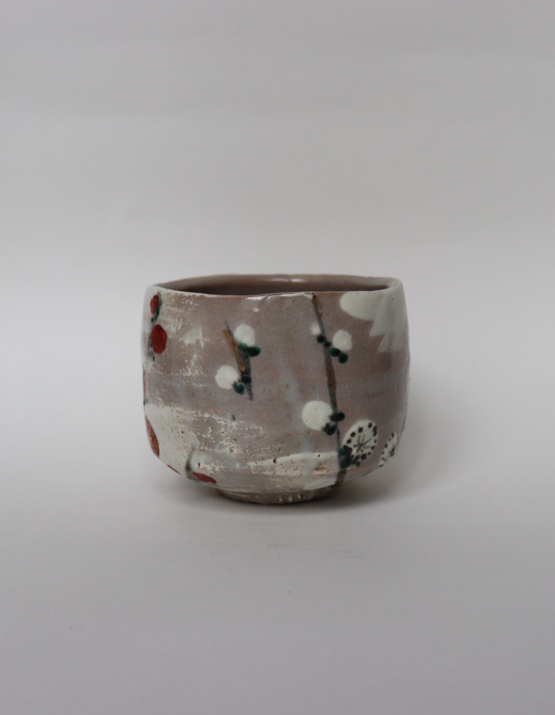 Son œuvre, connue sous le nom d’« Arakawa Shino », se distingue par une pâte épaisse et douce, une glaçure blanche légèrement rosée et une texture ponctuée de petites cavités naturelles dues à la cuisson. Dans ce bol, Arakawa a représenté des branches de prunier rouges et blanches — un motif appelé eda-ume (枝梅), symbole d’endurance et de renouveau. Ces fleurs, qui peuvent éclore avant la fonte des neiges, évoquent la beauté des saisons japonaises et la coexistence du froid et de la vie renaissante. Ce type de décor, apparu à l’époque Momoyama, figurait souvent dans les tissus et objets de cérémonie, où la combinaison du blanc de la neige et du rouge du prunier exprimait la pureté et la vitalité.