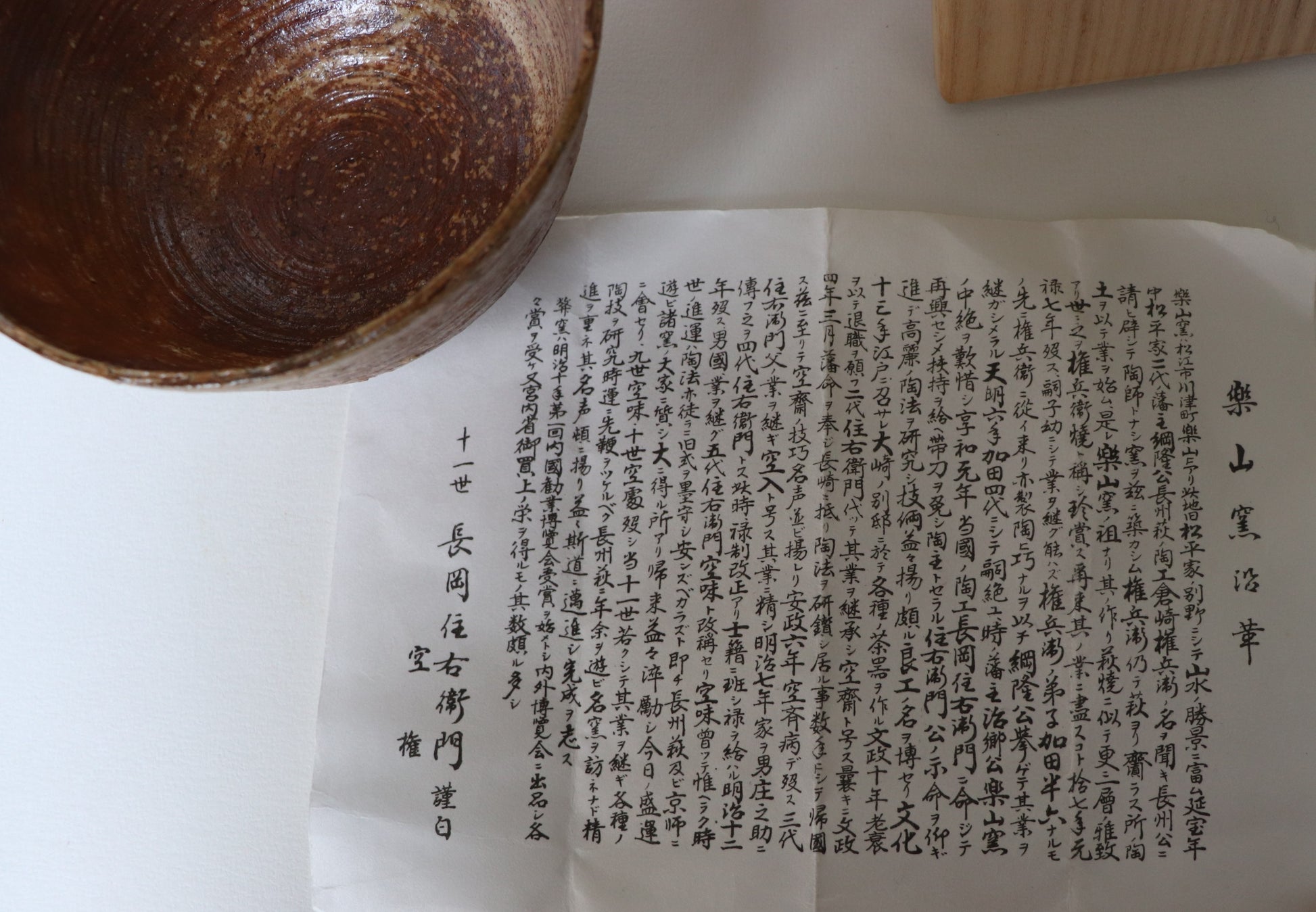 This matcha bowl was crafted by Nagaoka Sumiemon XI (Nagaoka Kūken), master potter of the Rakuzan Kiln in Matsue, Shimane Prefecture. Born in 1929, the son of the 10th Sumiemon, he apprenticed under the distinguished Korean-Japanese potter Saka Koraizaemon XI before succeeding to the family name in 1965. In 1987, he became a full member of the Japan Traditional Art Crafts Association, and in 2000 he was designated as a Living Cultural Property of Shimane Prefecture.