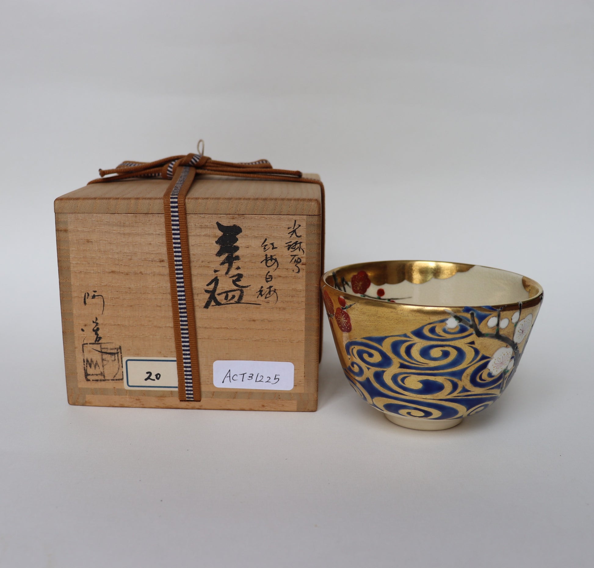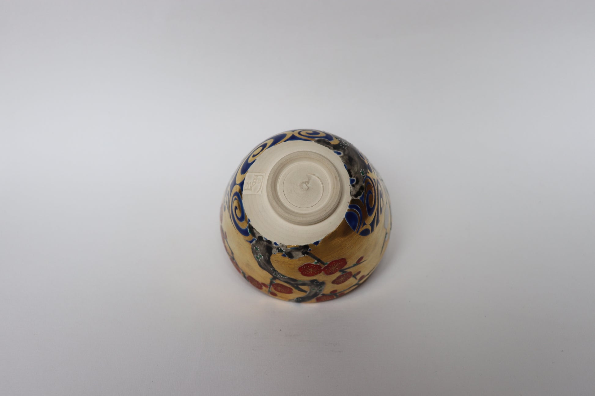 This matcha bowl was crafted by Azan Tsūji, one of Kyoto’s leading tea ceramics artists, whose work bridges Kutani and Kyō-yaki traditions. While grounded in classical forms, Tsūji is known for his distinctly modern sensibility, integrating overglaze enamels, gold decoration, blue-and-white porcelain, and Raku techniques into a lively and elegant style that captivates tea practitioners and collectors alike.
