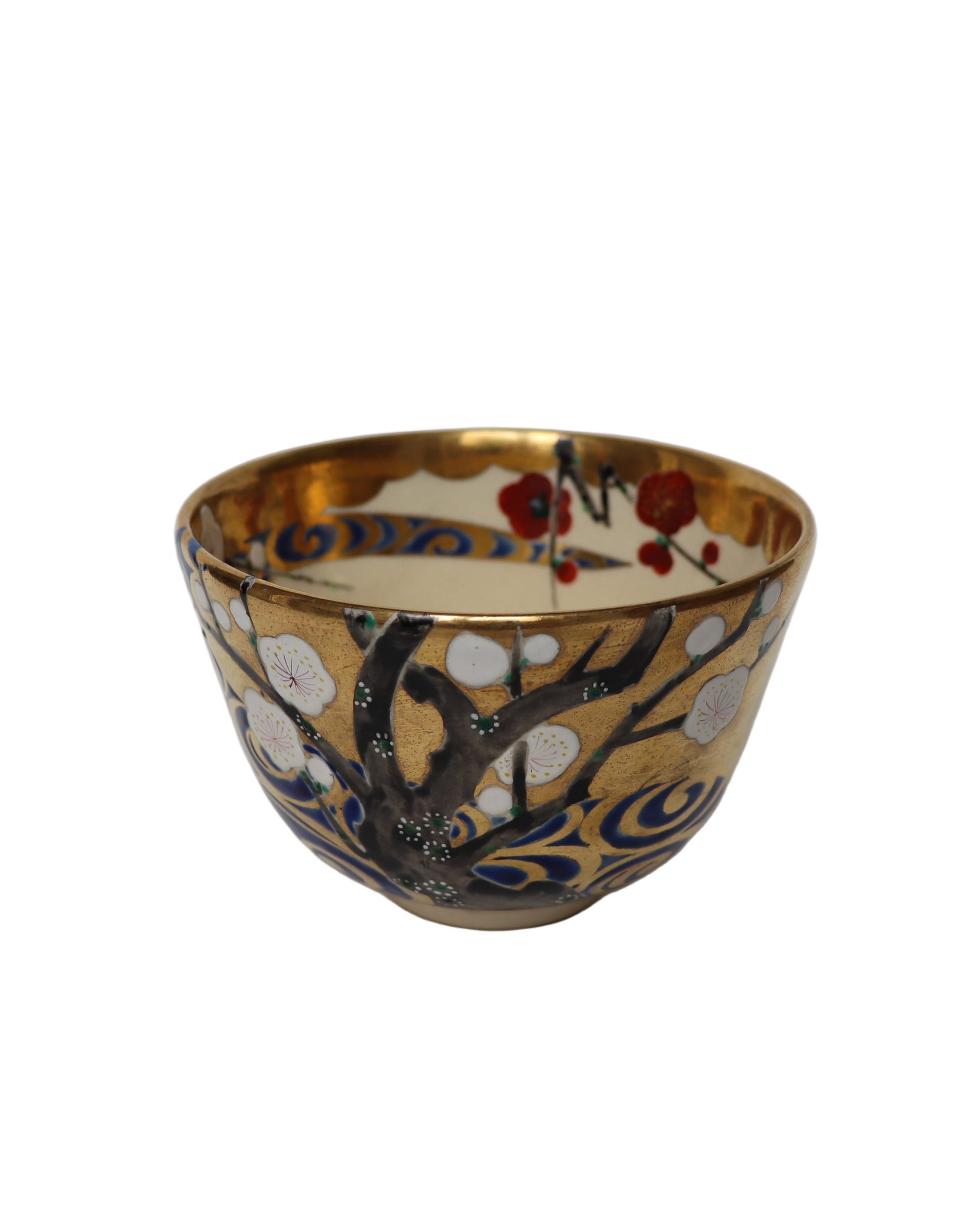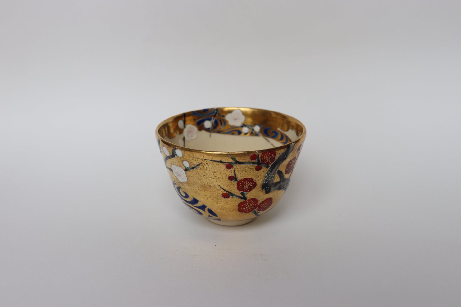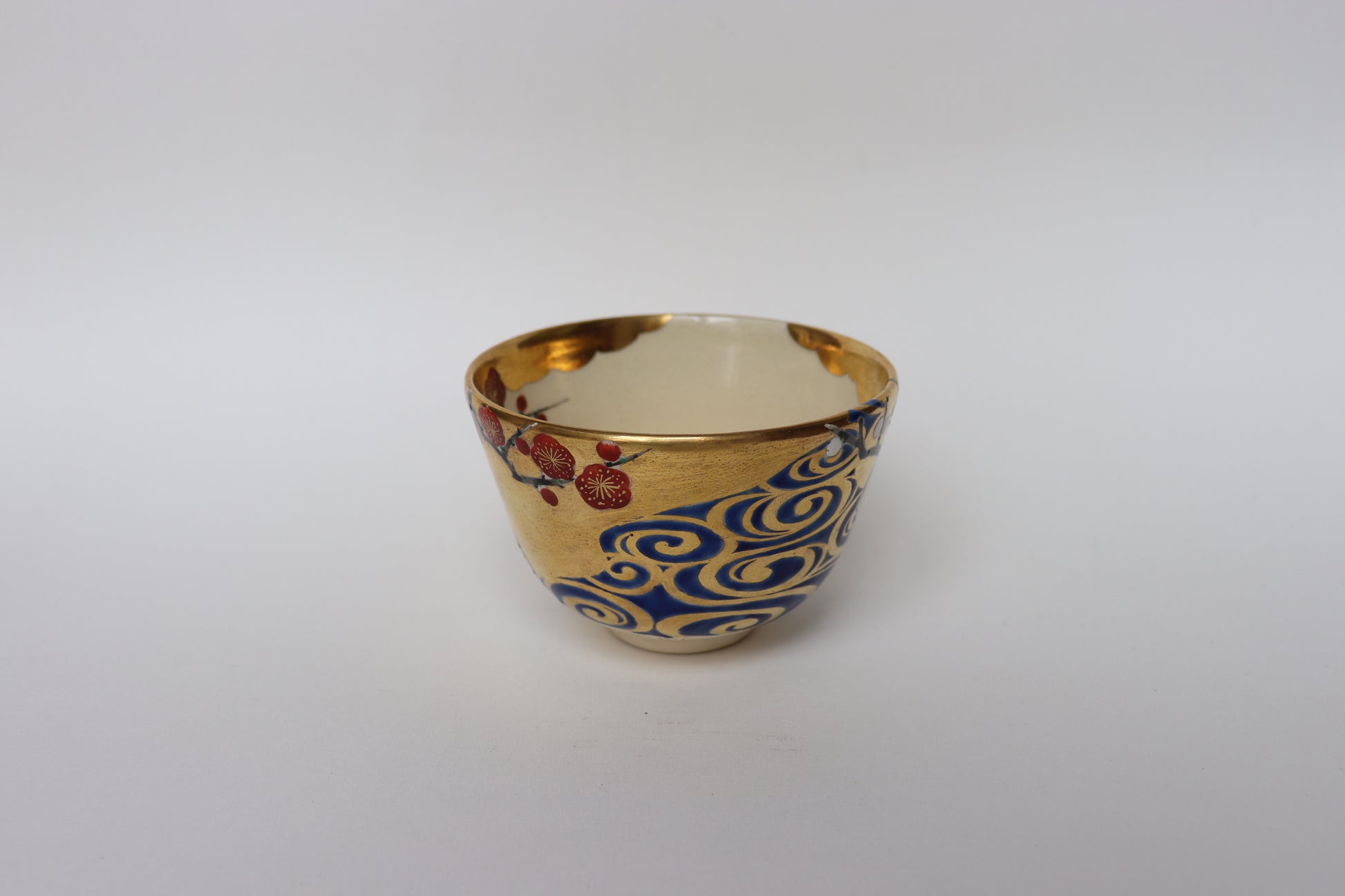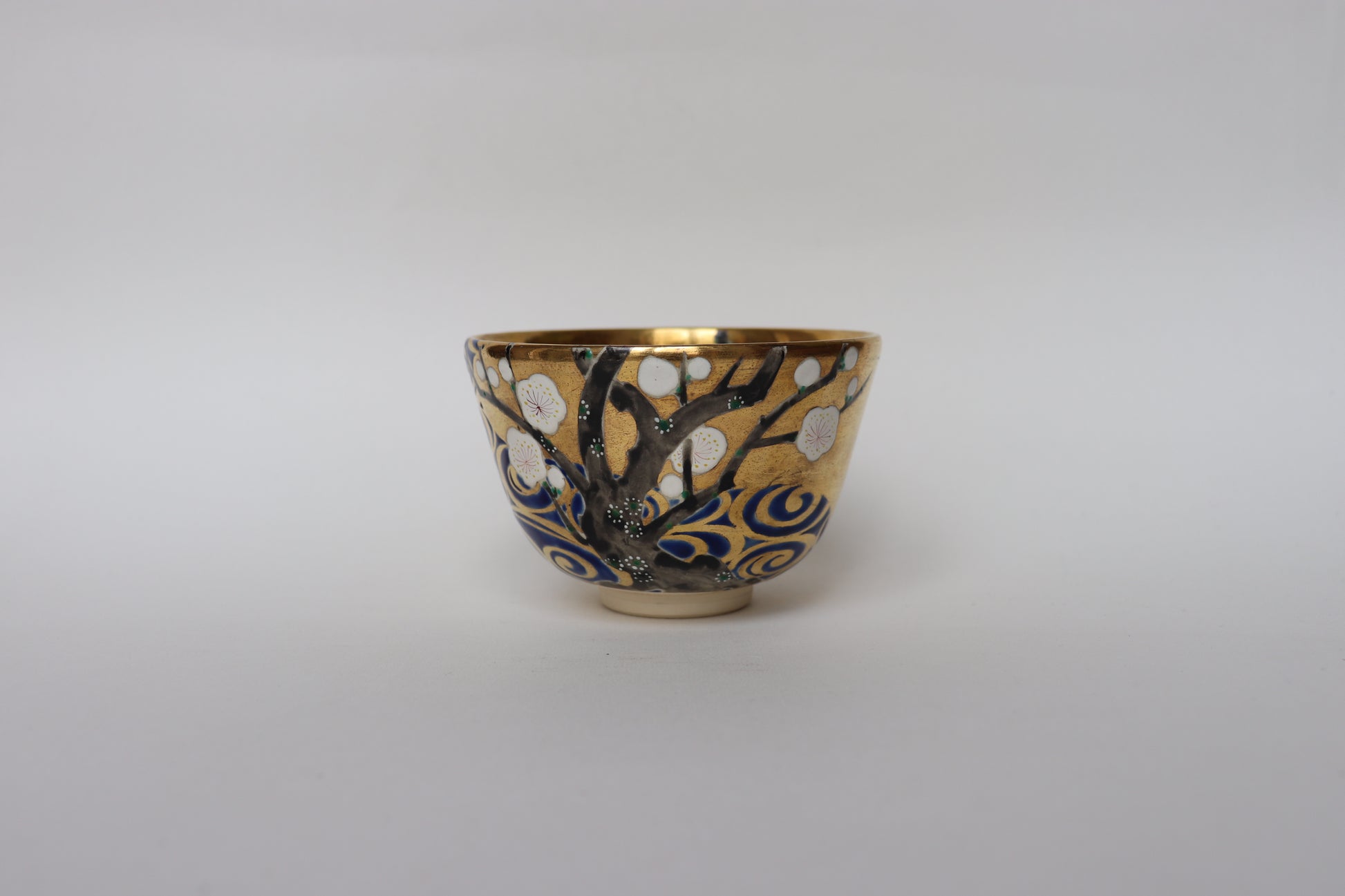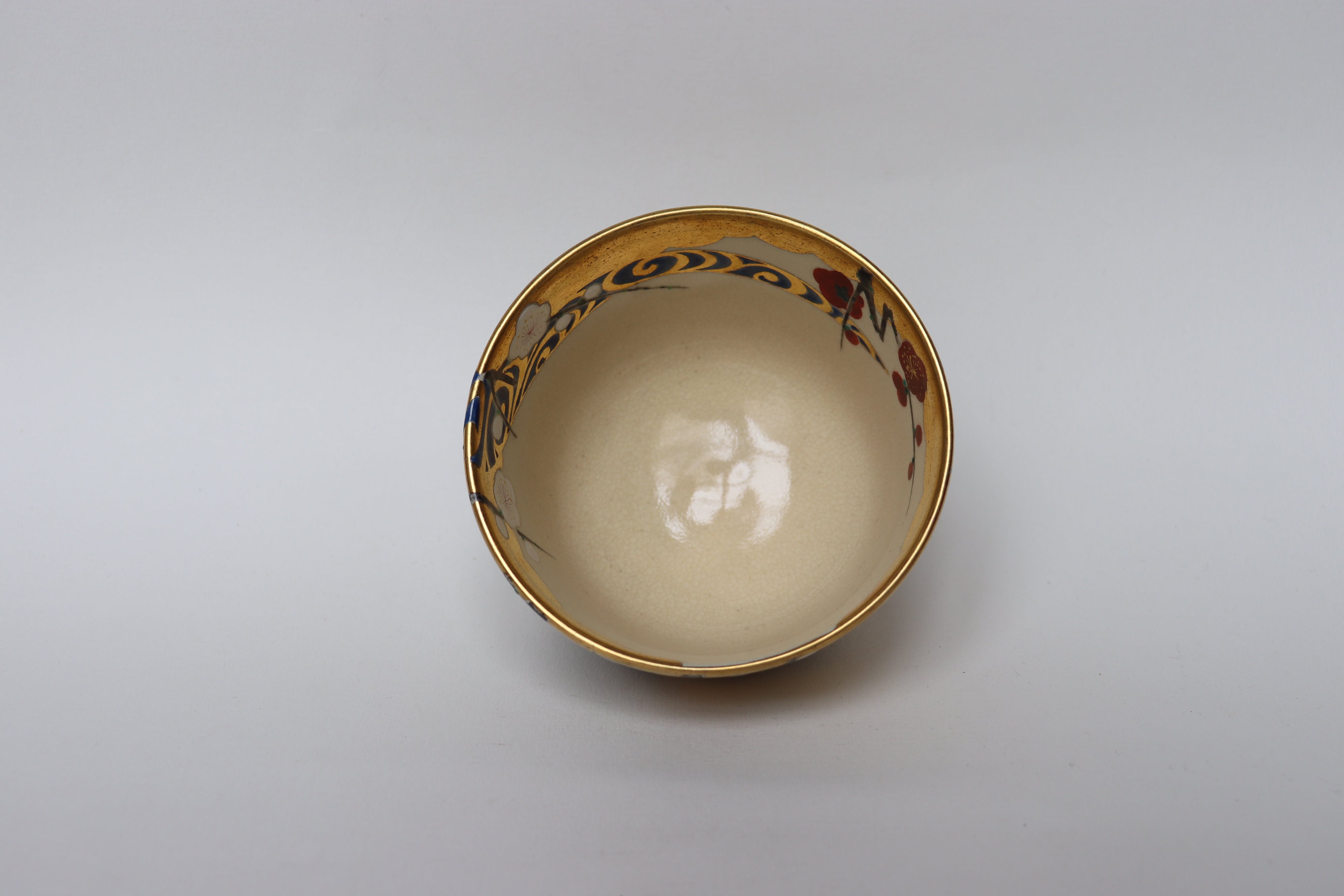 Sur ce bol, Azan Tsūji transpose ce dialogue visuel et symbolique dans la matière céramique. Les fleurs de prunier rouges et blanches, délicatement peintes sur une glaçure ivoire, se répondent à travers une fine rivière stylisée, rendue par des reflets argentés. Les accents d’or viennent rehausser l’ensemble, évoquant la brillance du paravent de Kōrin. Ce jeu d’oppositions — lumière et ombre, mouvement et silence — crée un espace visuel apaisant et poétique, fidèle à l’esprit du thé.