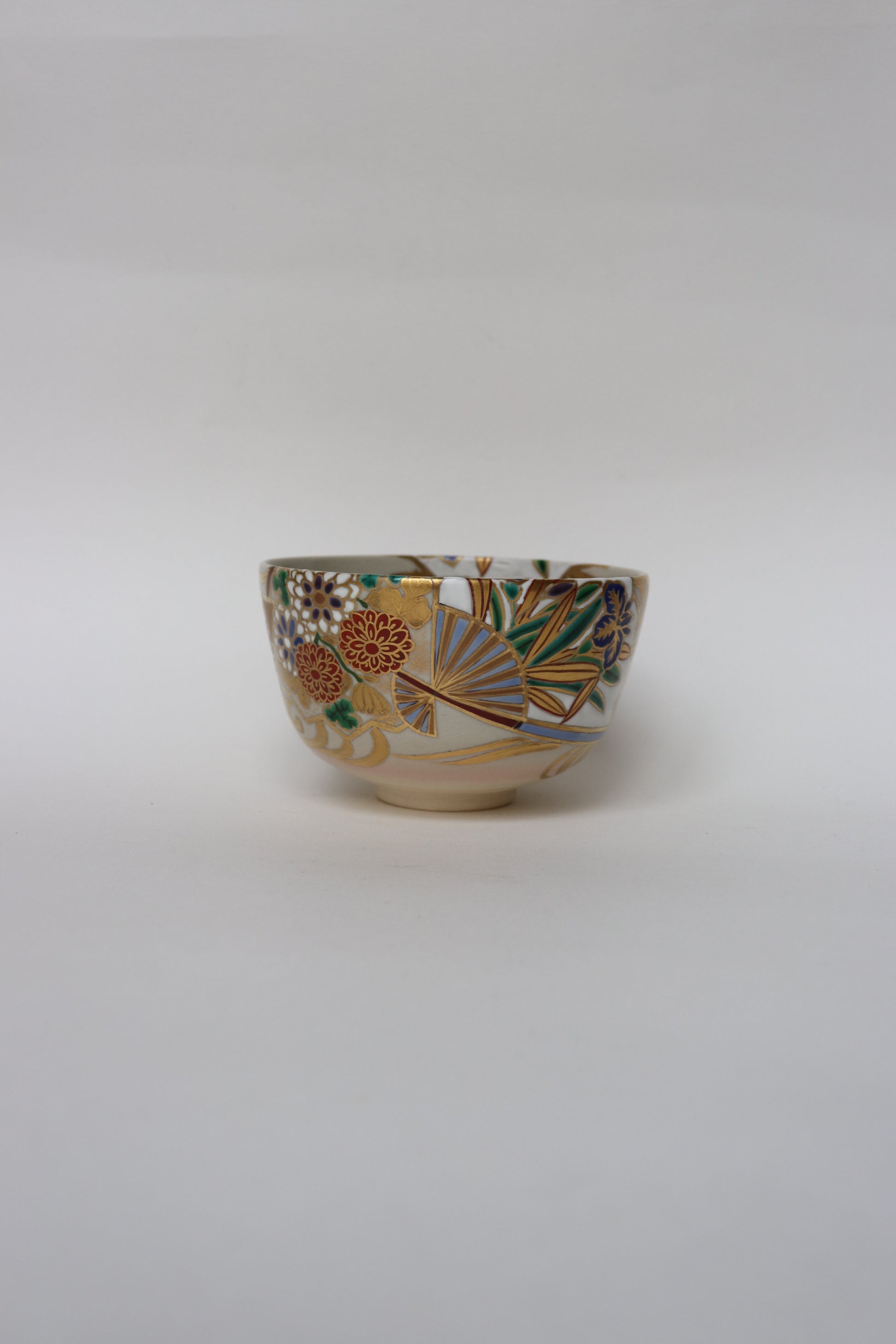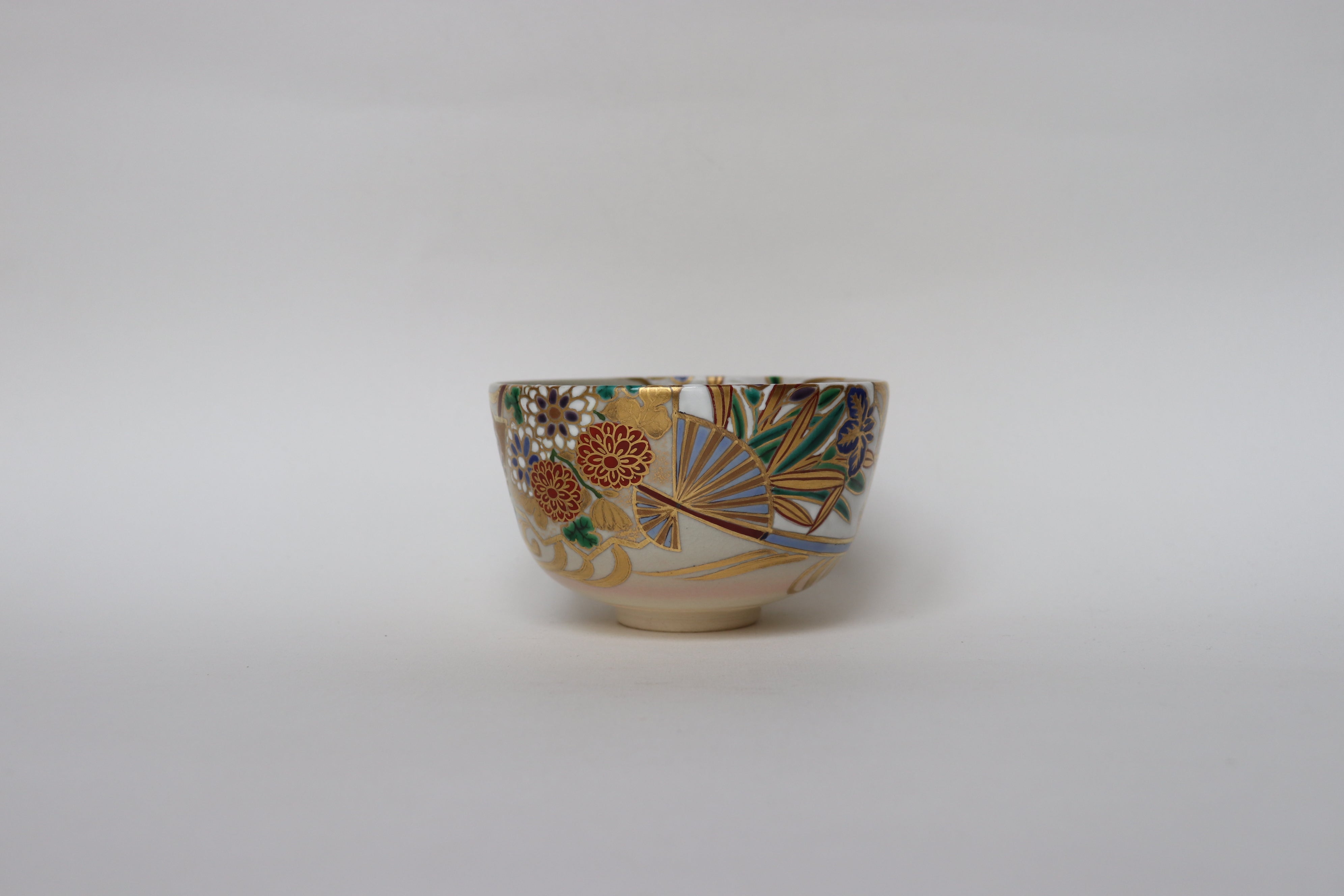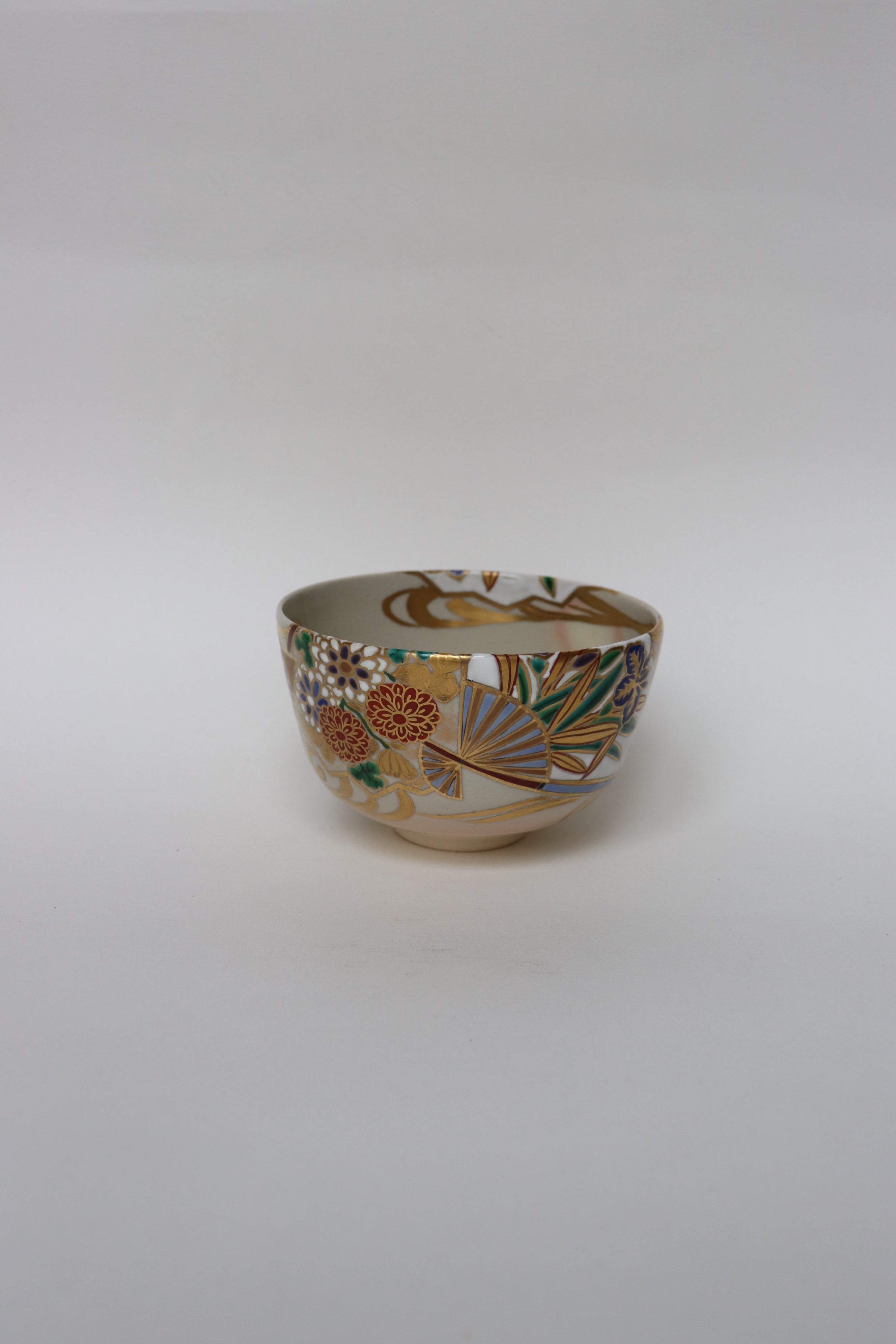 This matcha bowl, decorated with the fan motif (扇面文 / sensu-mon), is the work of master potter Miyagawa Kōun, the second generation of the Ryūkoku Kiln (Ryūkoku-gama). Descended from the renowned Miyagawa Kōsai family, founders of the celebrated Makuzu ware, Kōun continues the elegant and highly refined tradition of Kyōyaki / Kiyomizuyaki ceramics in Kyoto.