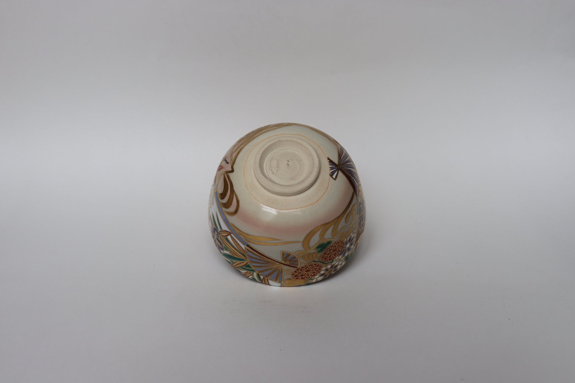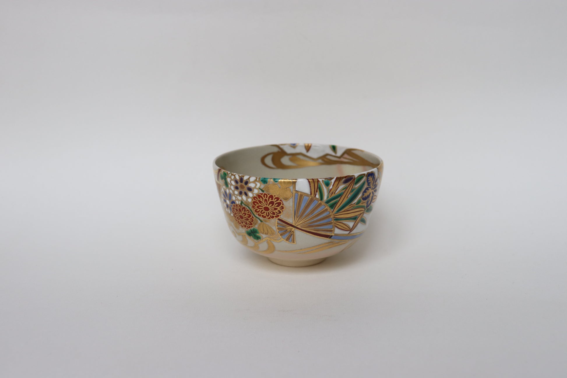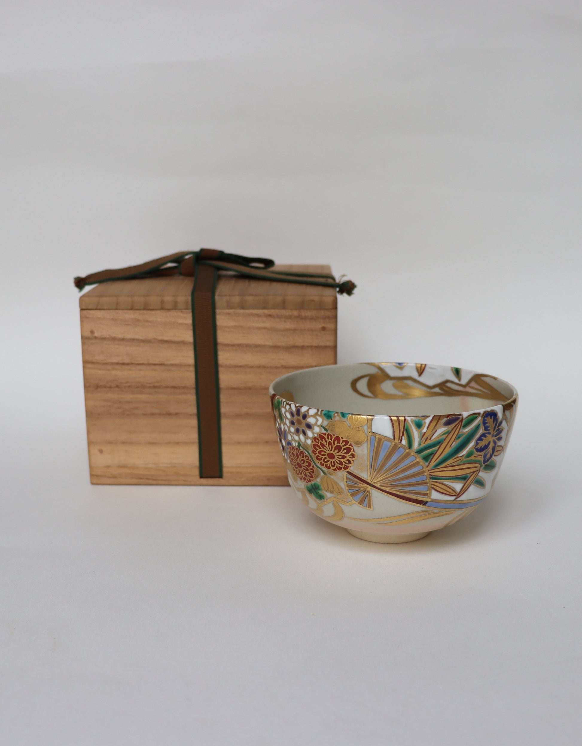 This matcha bowl, decorated with the fan motif (扇面文 / sensu-mon), is the work of master potter Miyagawa Kōun, the second generation of the Ryūkoku Kiln (Ryūkoku-gama). Descended from the renowned Miyagawa Kōsai family, founders of the celebrated Makuzu ware, Kōun continues the elegant and highly refined tradition of Kyōyaki / Kiyomizuyaki ceramics in Kyoto.