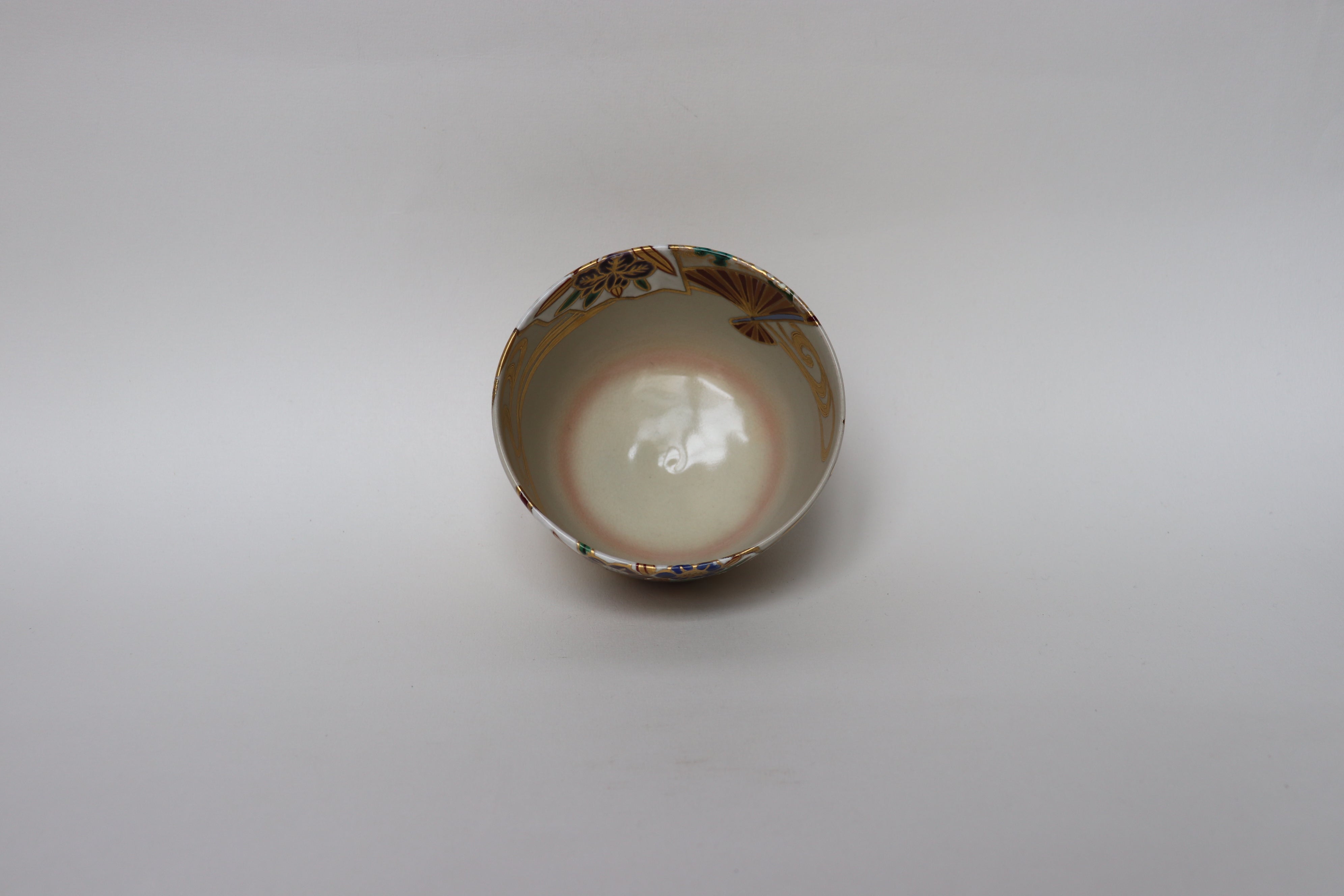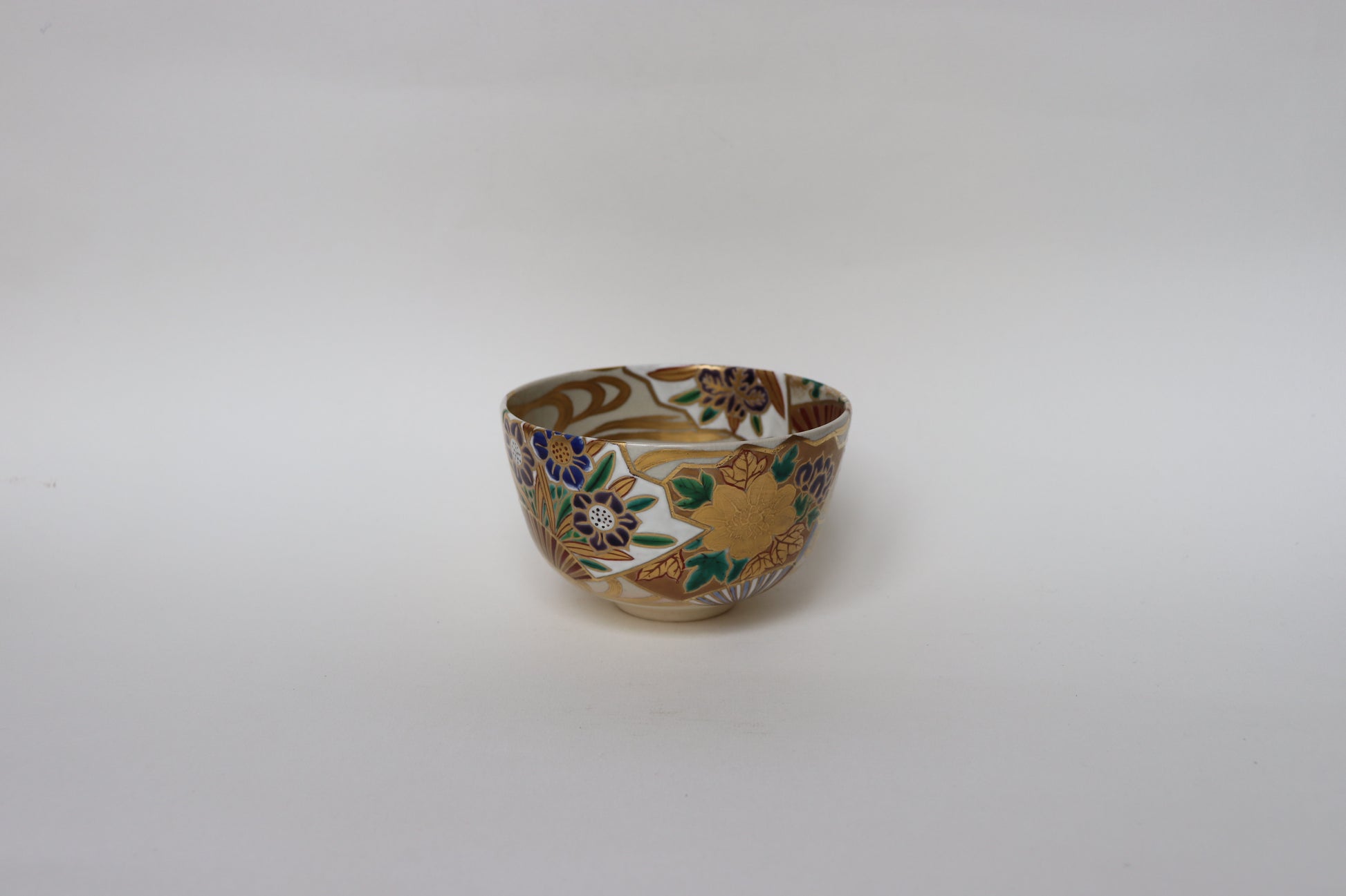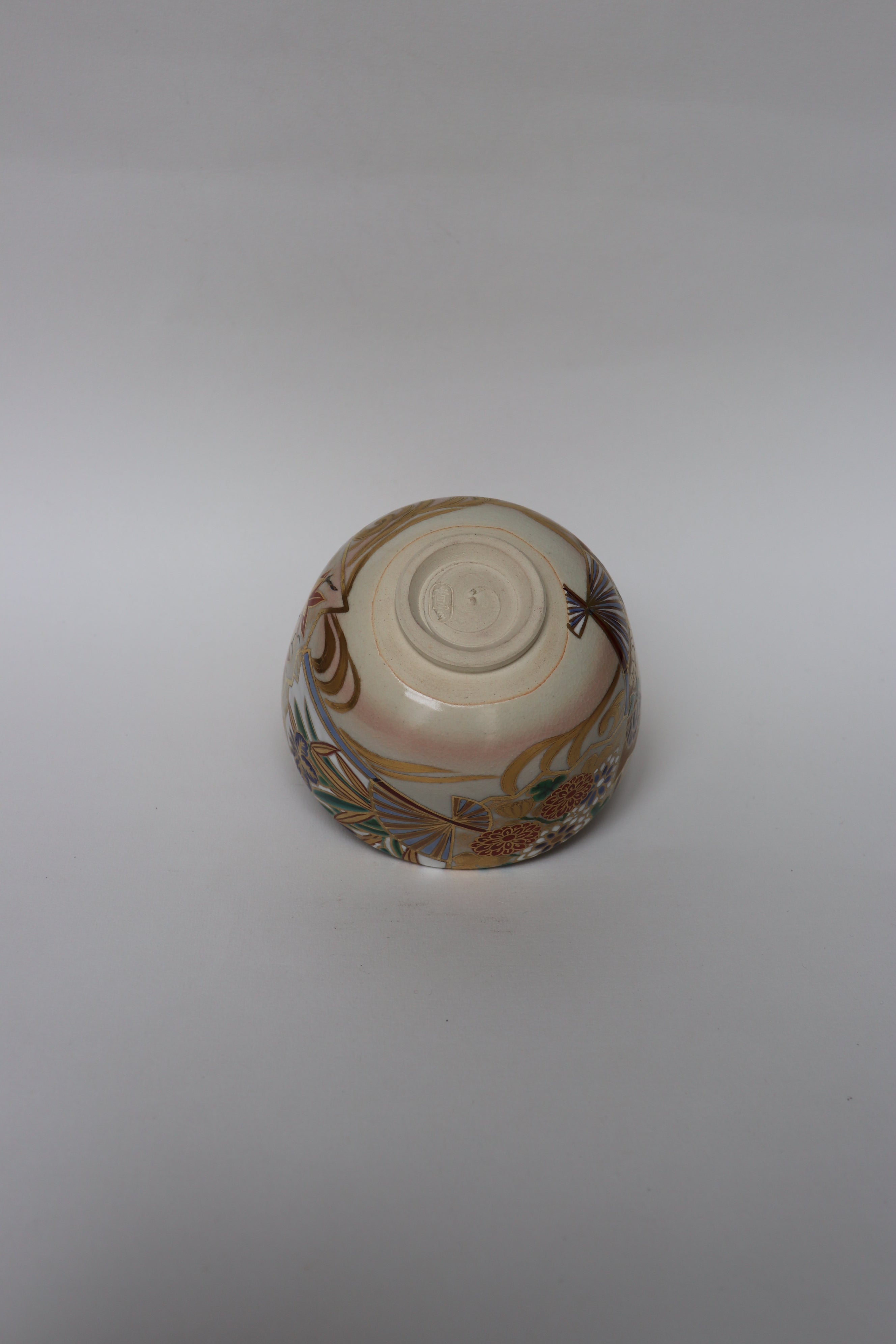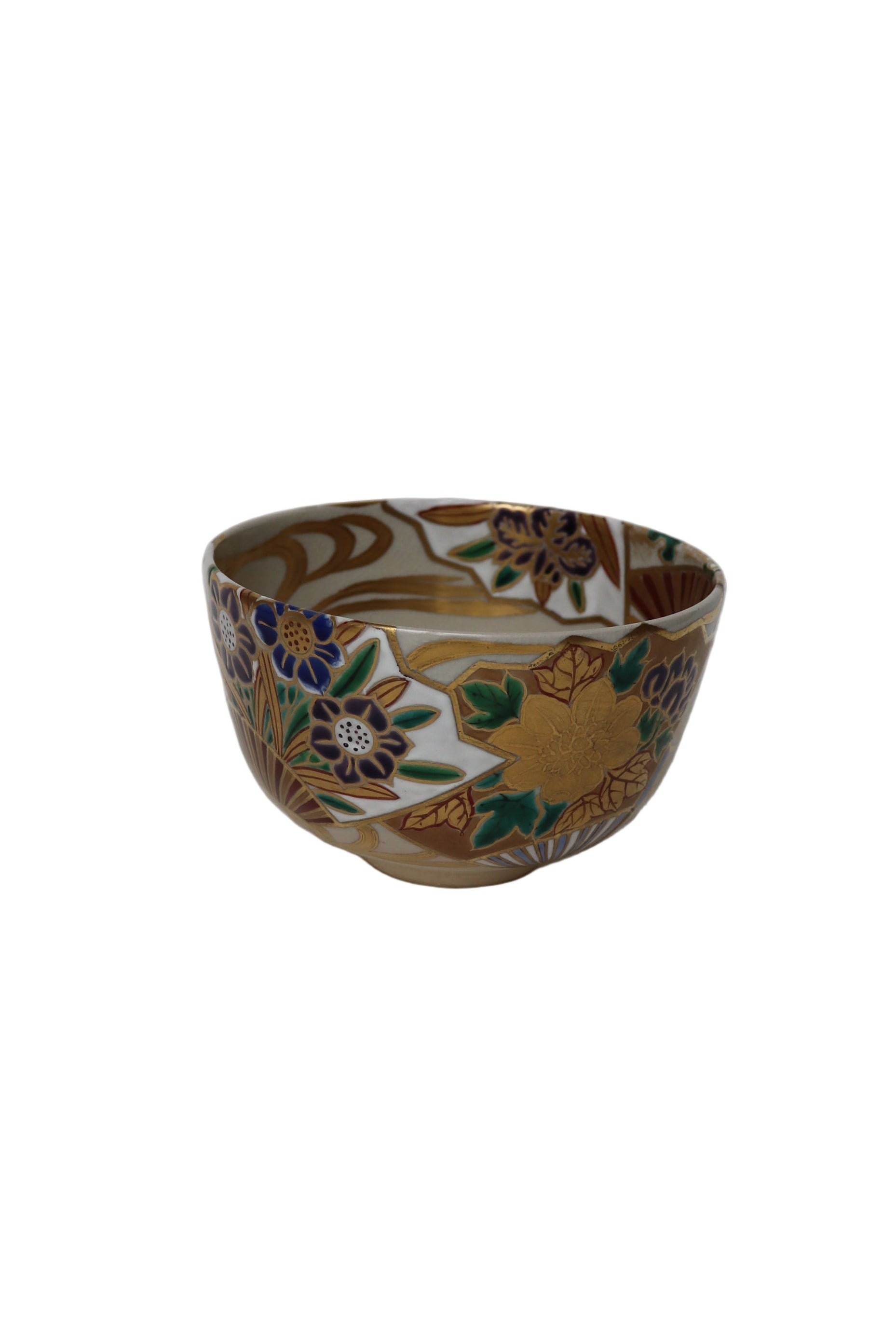 La céramique de Miyagawa Kōun se distingue par son raffinement pictural et la diversité de ses techniques : reproductions de styles Ninsei et Kenzan, motifs Kōchi, Shonzui kinrande et sometsuke. Le bol allie l’éclat des émaux colorés à une composition équilibrée, typique des ateliers de Kyoto, où la virtuosité technique rencontre la sensibilité esthétique de la voie du thé.