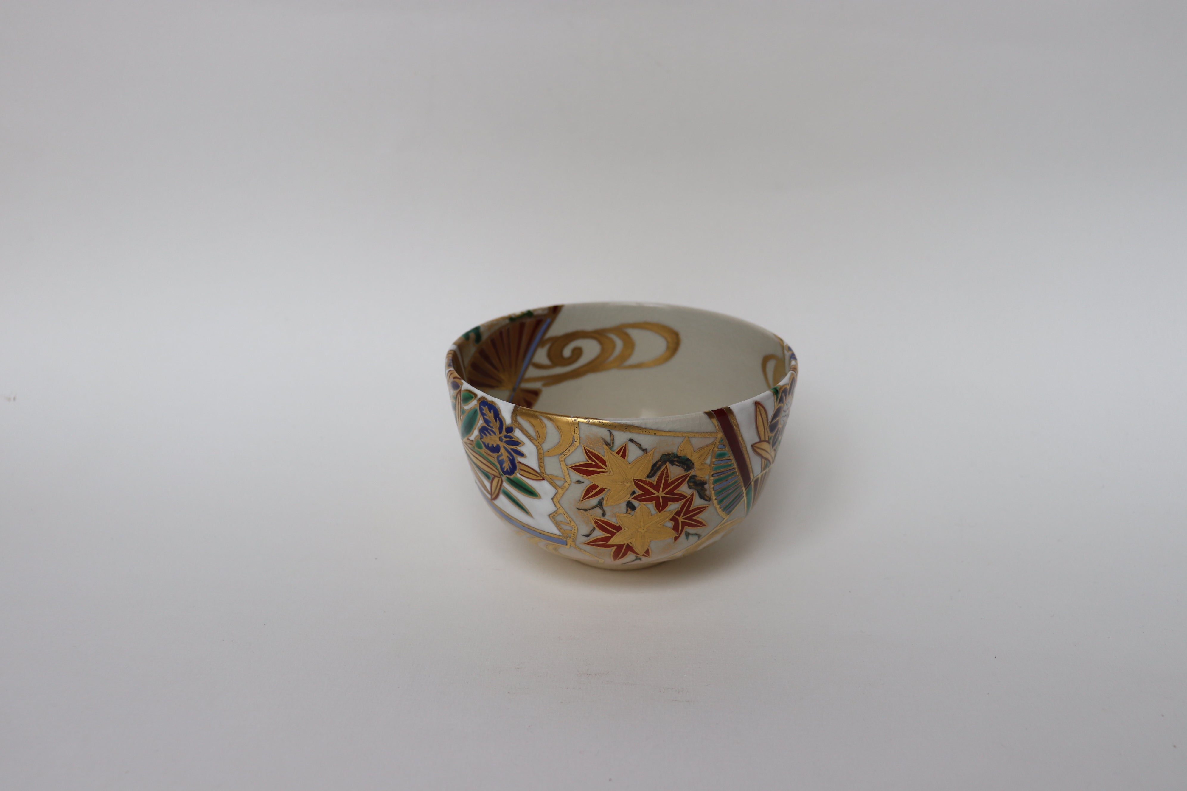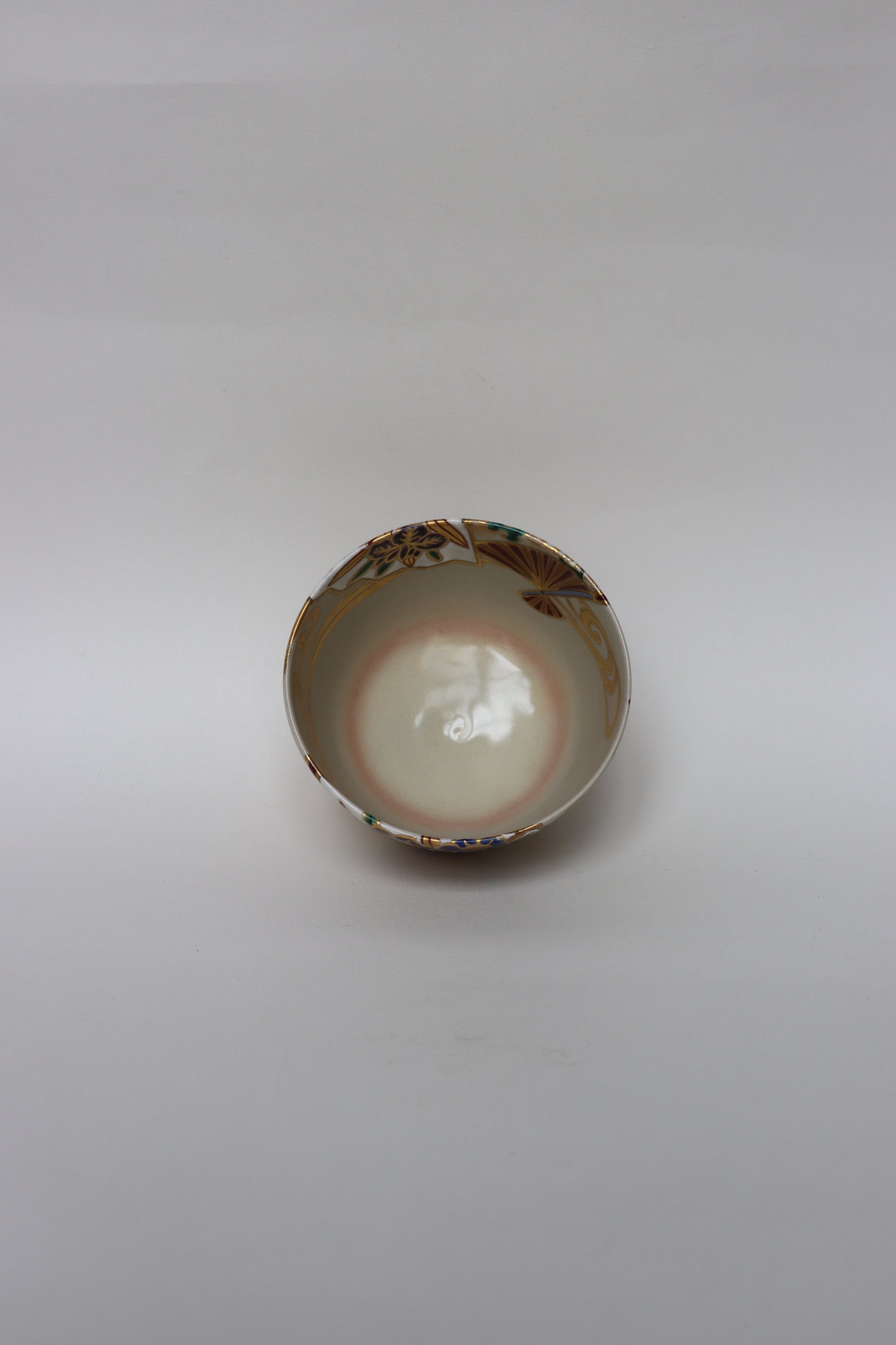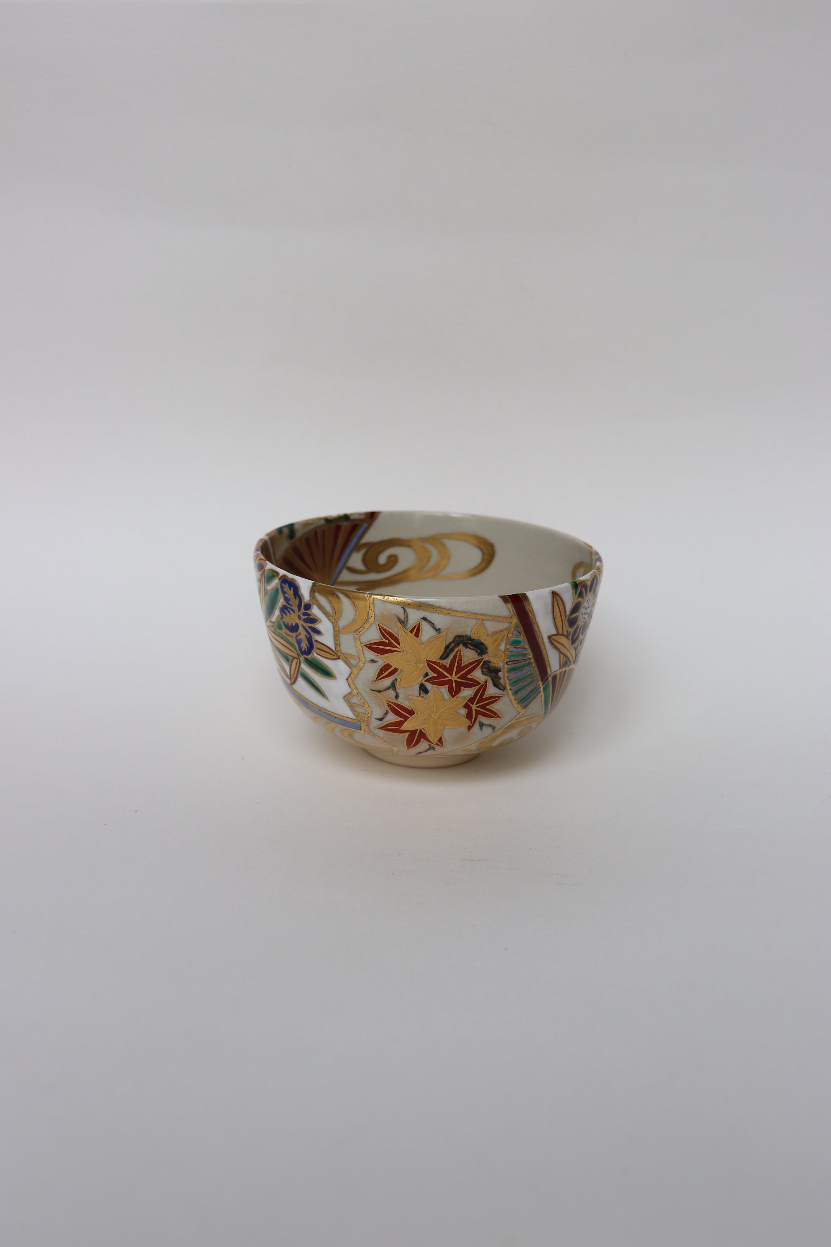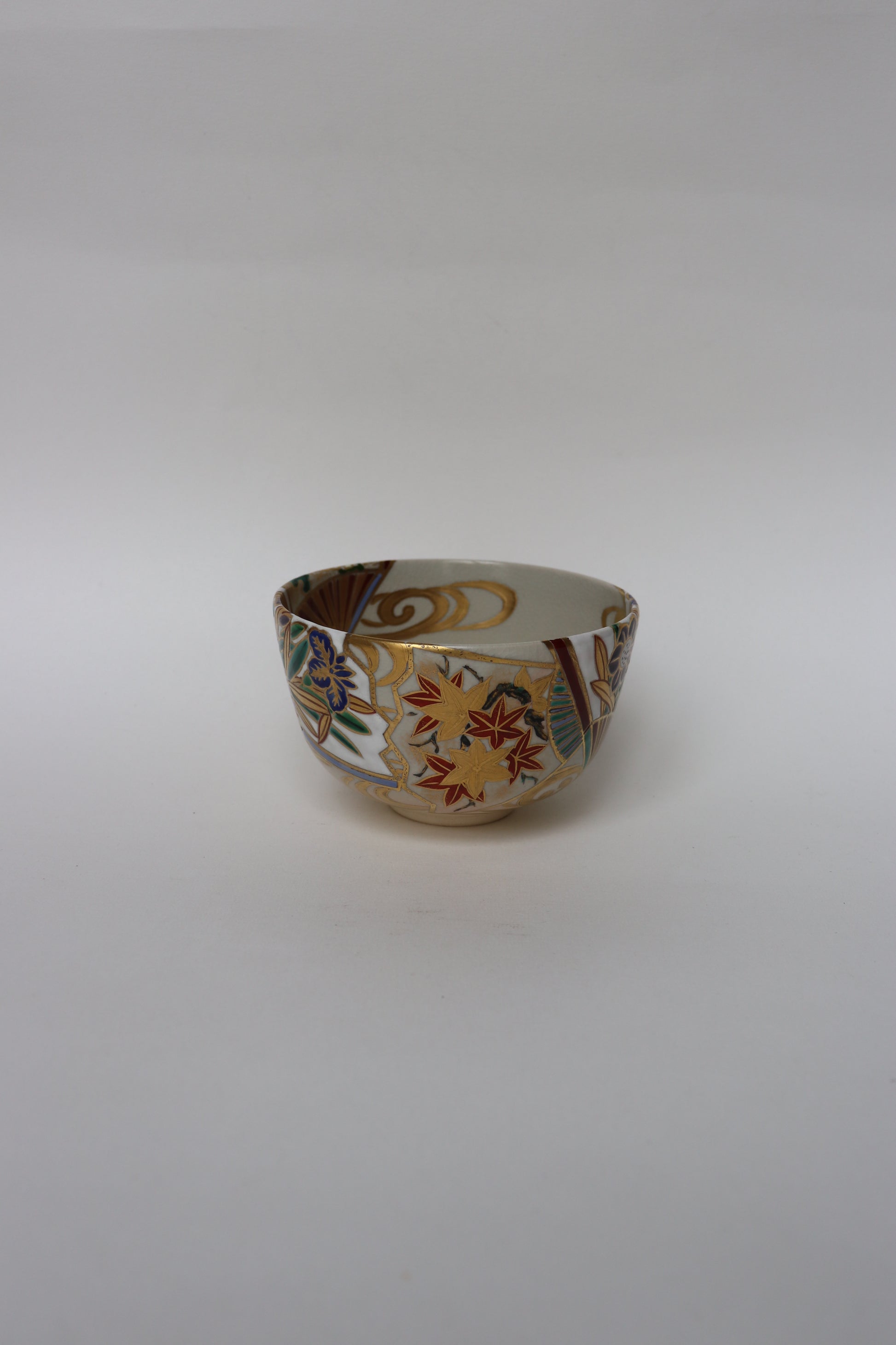 La céramique de Miyagawa Kōun se distingue par son raffinement pictural et la diversité de ses techniques : reproductions de styles Ninsei et Kenzan, motifs Kōchi, Shonzui kinrande et sometsuke. Le bol allie l’éclat des émaux colorés à une composition équilibrée, typique des ateliers de Kyoto, où la virtuosité technique rencontre la sensibilité esthétique de la voie du thé.
