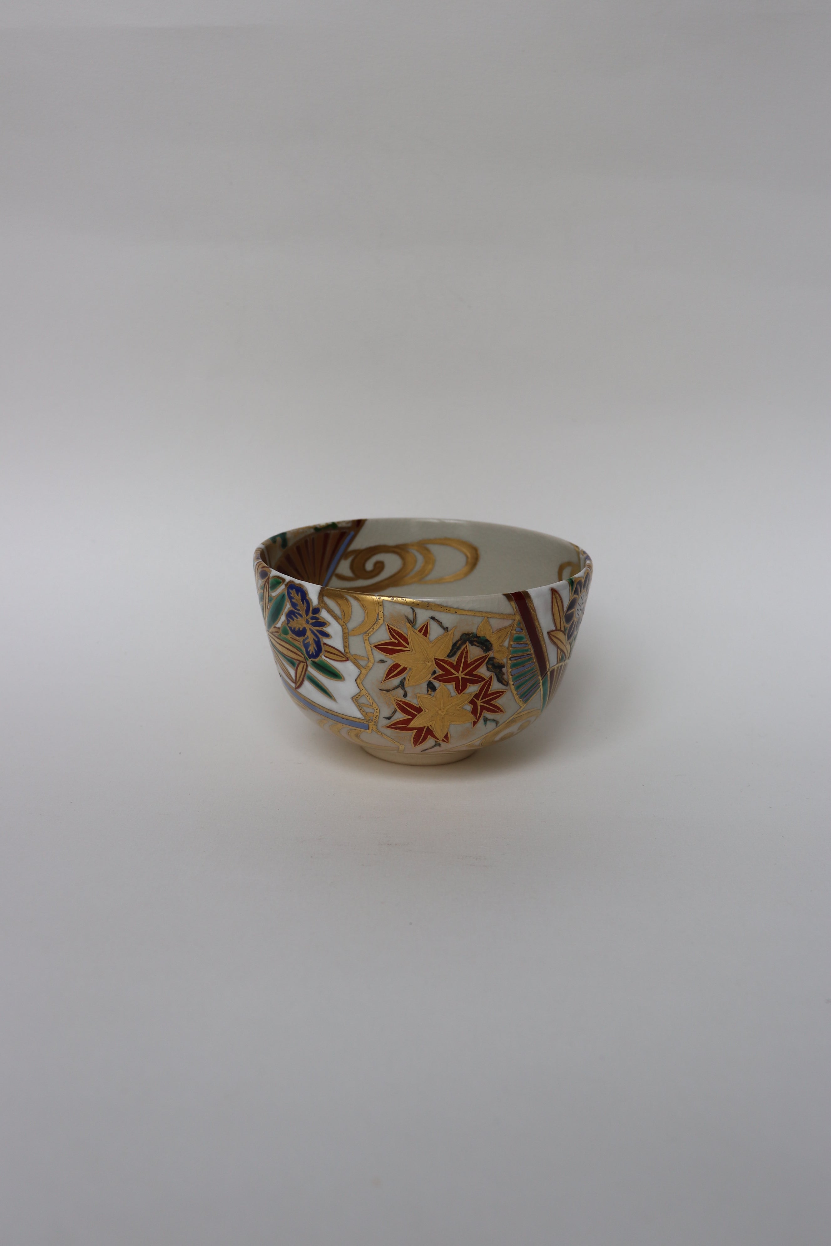 Ce bol à matcha, orné du motif d’éventail (senmen-mon), est une création du maître céramiste Miyagawa Kōun, deuxième génération du four Ryūkoku (Ryūkoku-gama). Héritier d’une lignée issue de la prestigieuse famille Miyagawa Kōsai, fondatrice du Makuzu-yaki, Kōun perpétue aujourd’hui à Kyoto l’élégance et la richesse technique du Kyō-yaki / Kiyomizu-yaki.