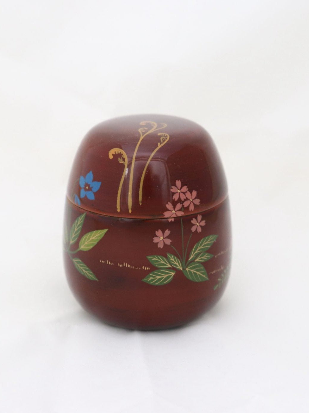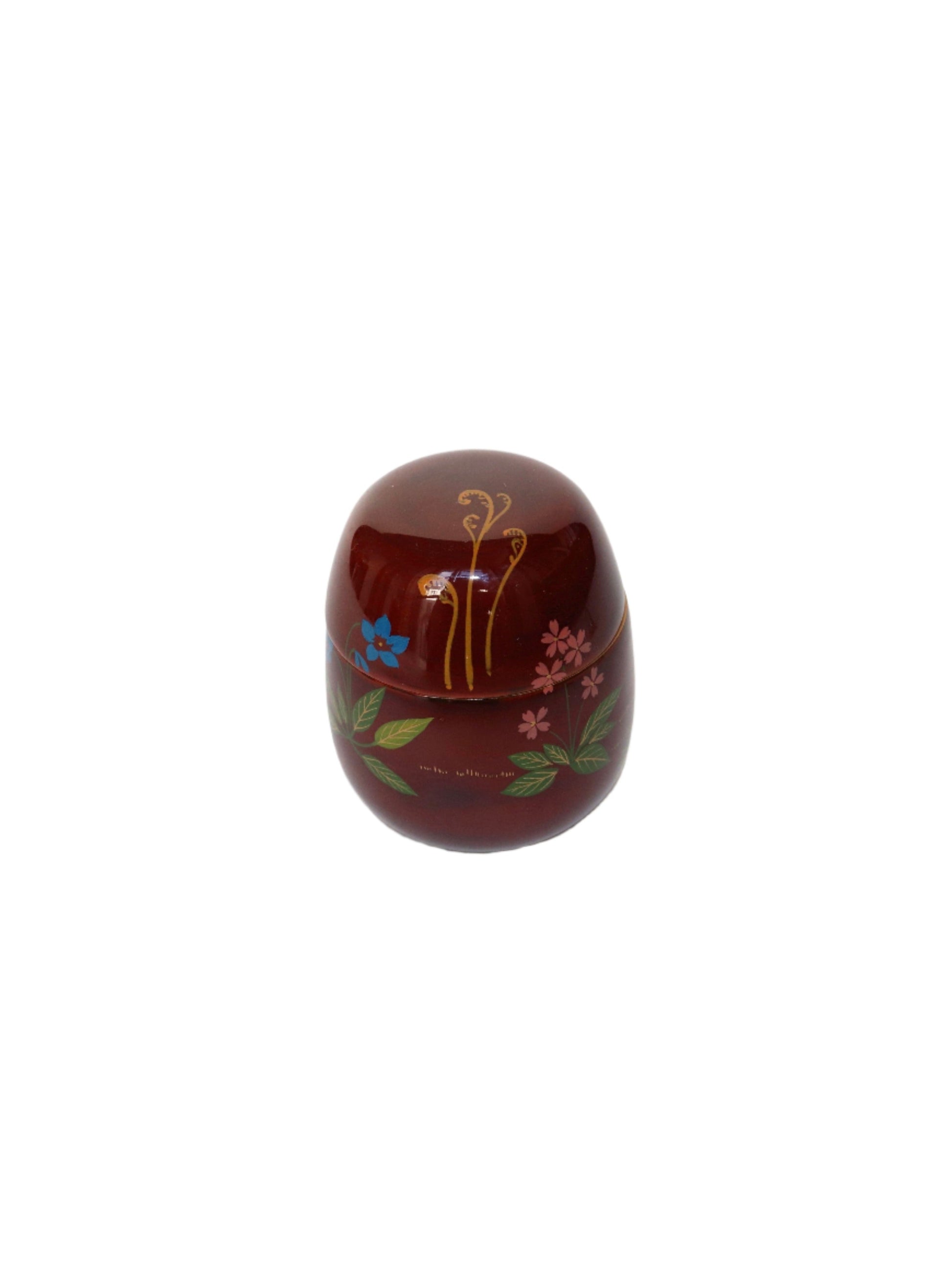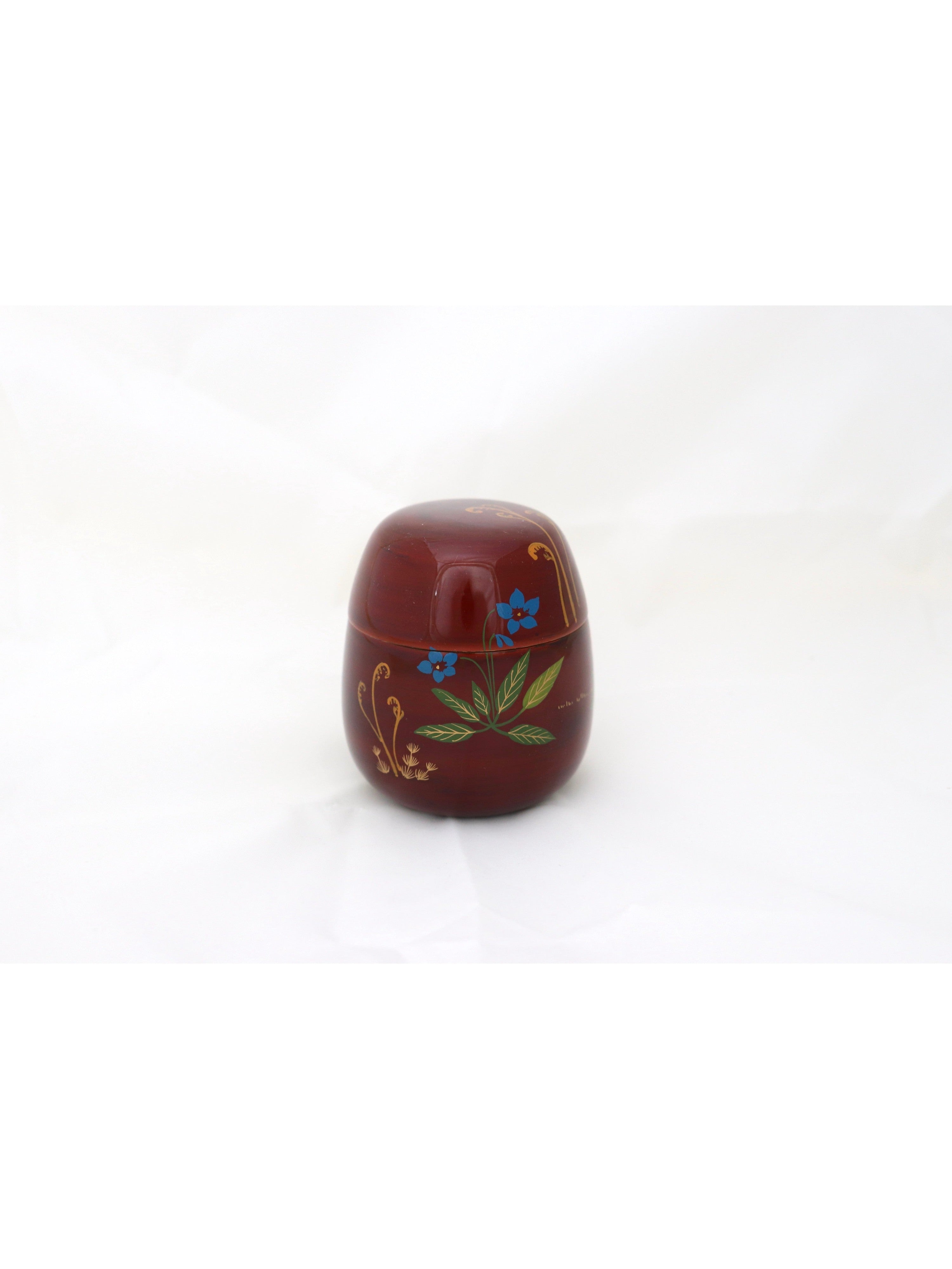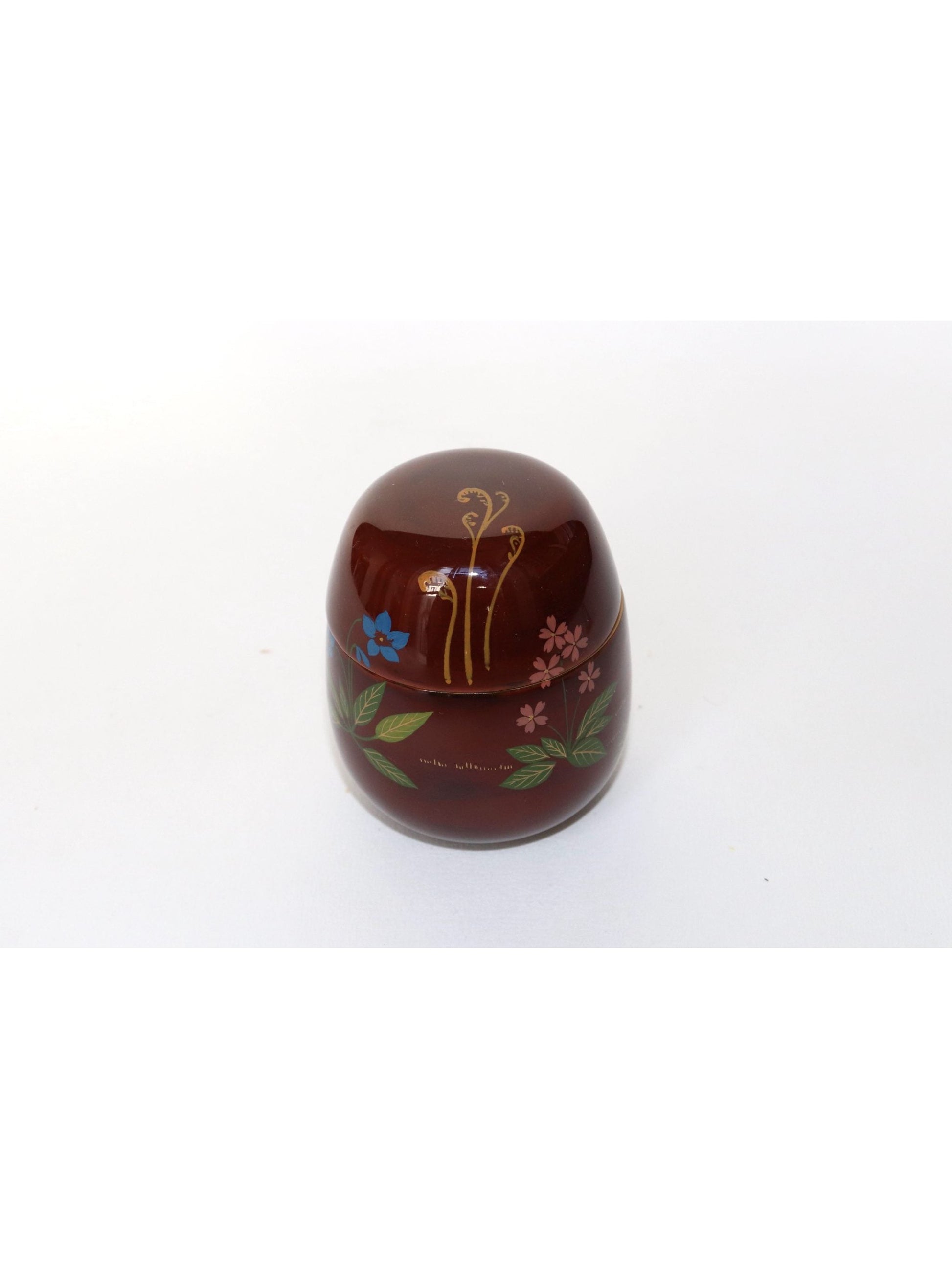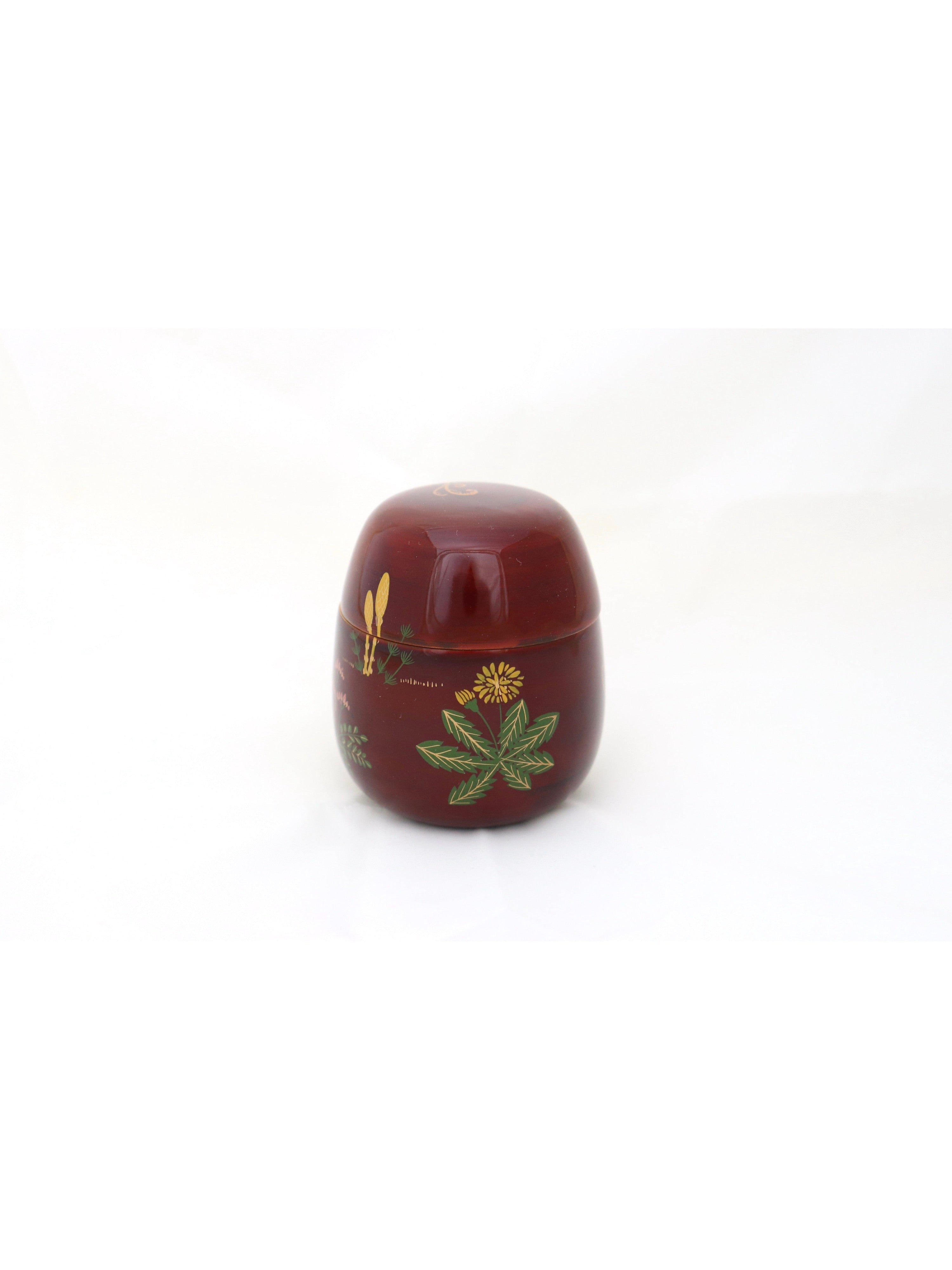 Boîte à matcha en bois laqué brun-rouge Tamé-nuri à motif de fleurs et plantes du printemps en makié : pousse de prêle, violette, pissenlit, fougère têtes de violon et primevère. Cette boîte à matcha est laquée selon une technique appelée tamé-nuri. L'application d'une couche de laque rouge puis d'une couche de laque transparente à forte teinte brune permet d'obtenir la couleur rouge-brun transparente unique de la laque. Il s'agit d'une belle couleur qui ne peut être obtenue qu'avec de la laque.
