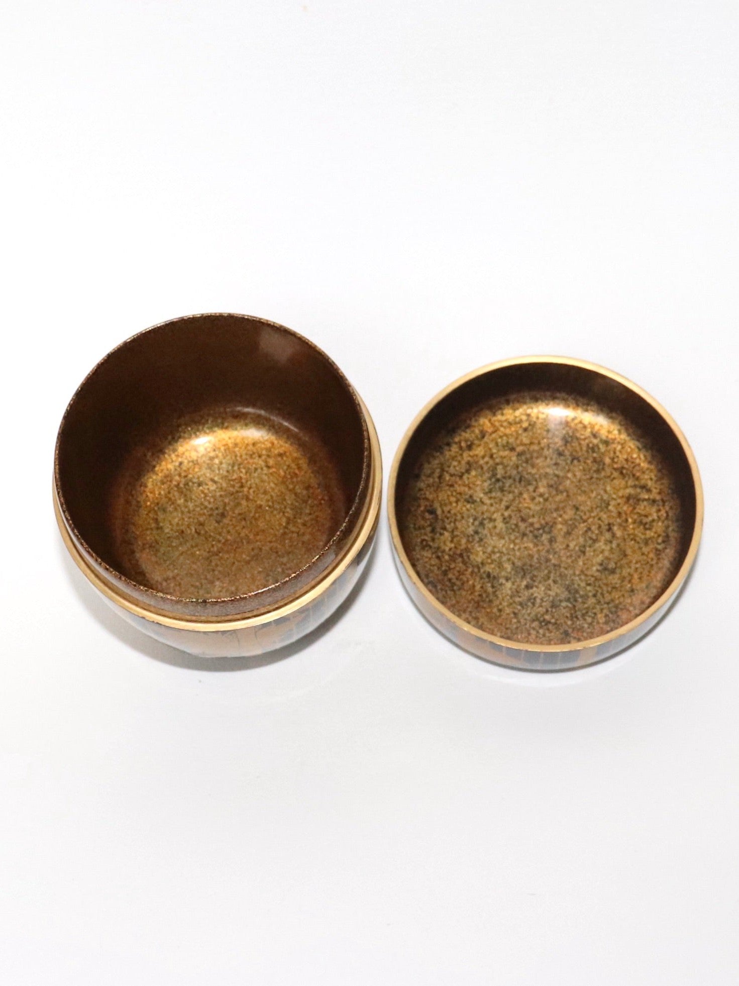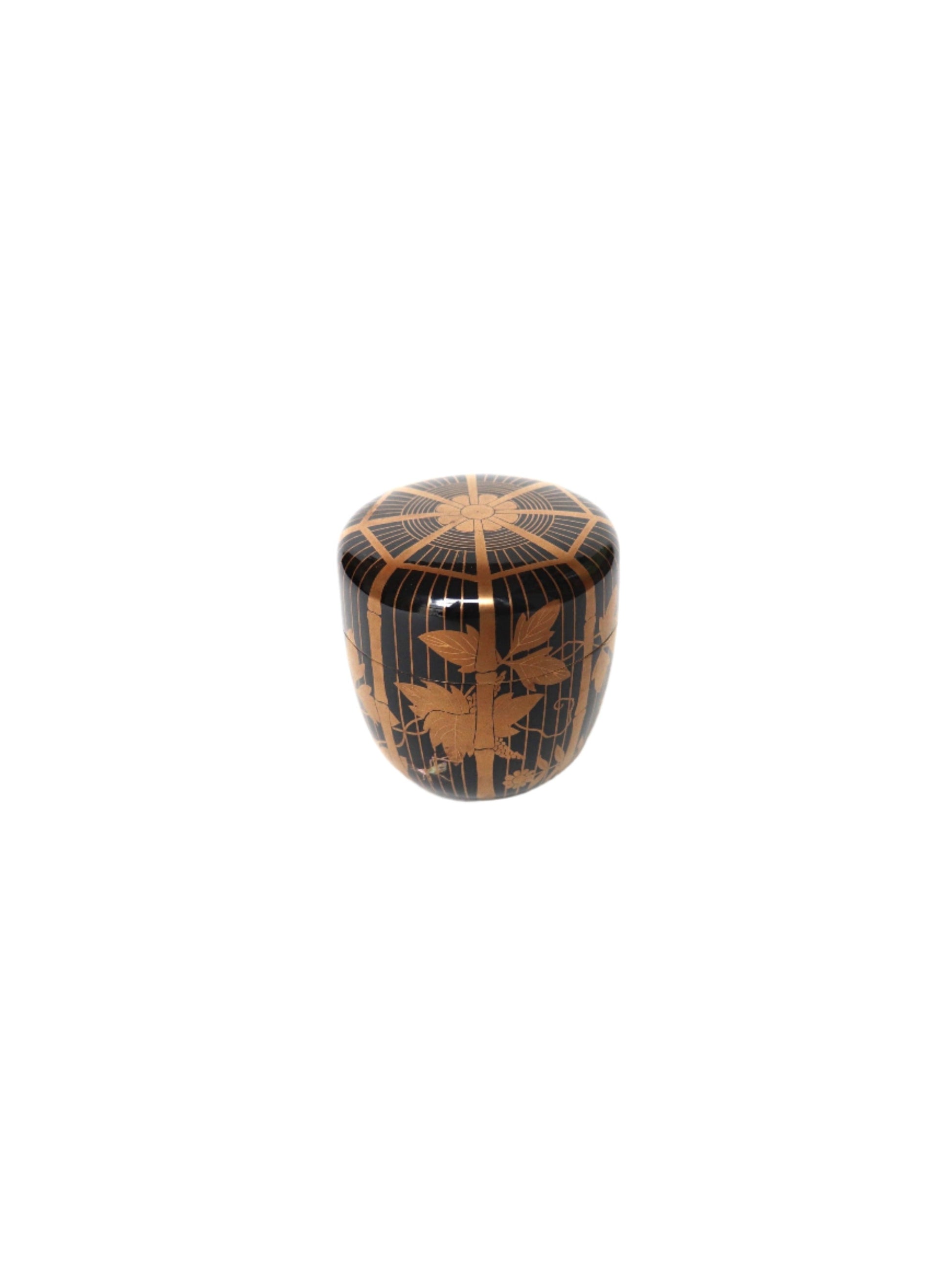 Boîte à matcha Natsumé en bois laqué noir à motif de cage à insecte en bambou et des plantes automnales en makié, et grillon en incrustation de nacre fabriquée au Japon à l'ère de Meiji (1868-1912). Les Japonais ressentent depuis longtemps l'arrivée de l'été avec le chant des grenouilles et des cigales, et l'automne avec le chant des grillons. On ne sait pas quand la culture de l'appréciation du son des insectes a commencé, mais le Manyoshu (Anthologie des Myriades de Feuilles), compilé à l'époque de Nara (710-794), contient de nombreux poèmes sur le son des insectes. En plus d'écouter le son des insectes à l'extérieur, les aristocrates de la période Heian attrapaient des insectes, les plaçaient dans des cages à insectes décorées et appréciaient le chant des insectes à l'intérieur. Au cours de la période Edo (1603-1868), le "mushi asobi" (jeux d'insecte) dont jouissaient les aristocrates de Heian s'est étendu au grand public, et des "vendeurs d'insectes" sont apparus, vendant une variété d'insectes et de cages à insectes.